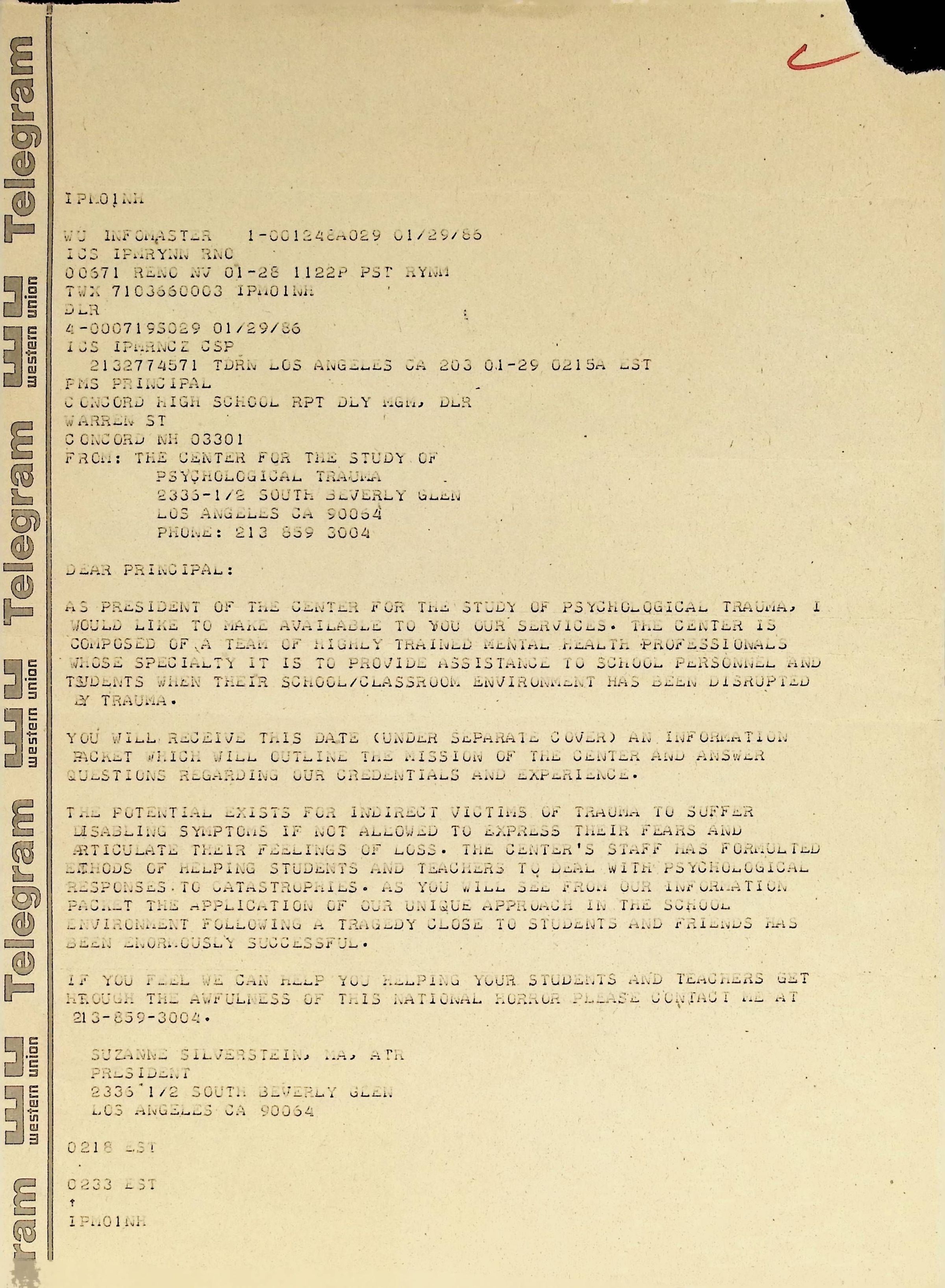 To Concord High School from The Center for the Study of Psychological Trauma