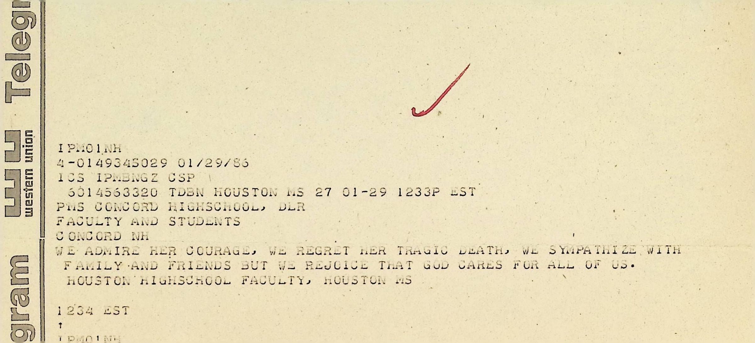 Western Union Telegram To Concord High School from Houston High School Dated 1/29/1986