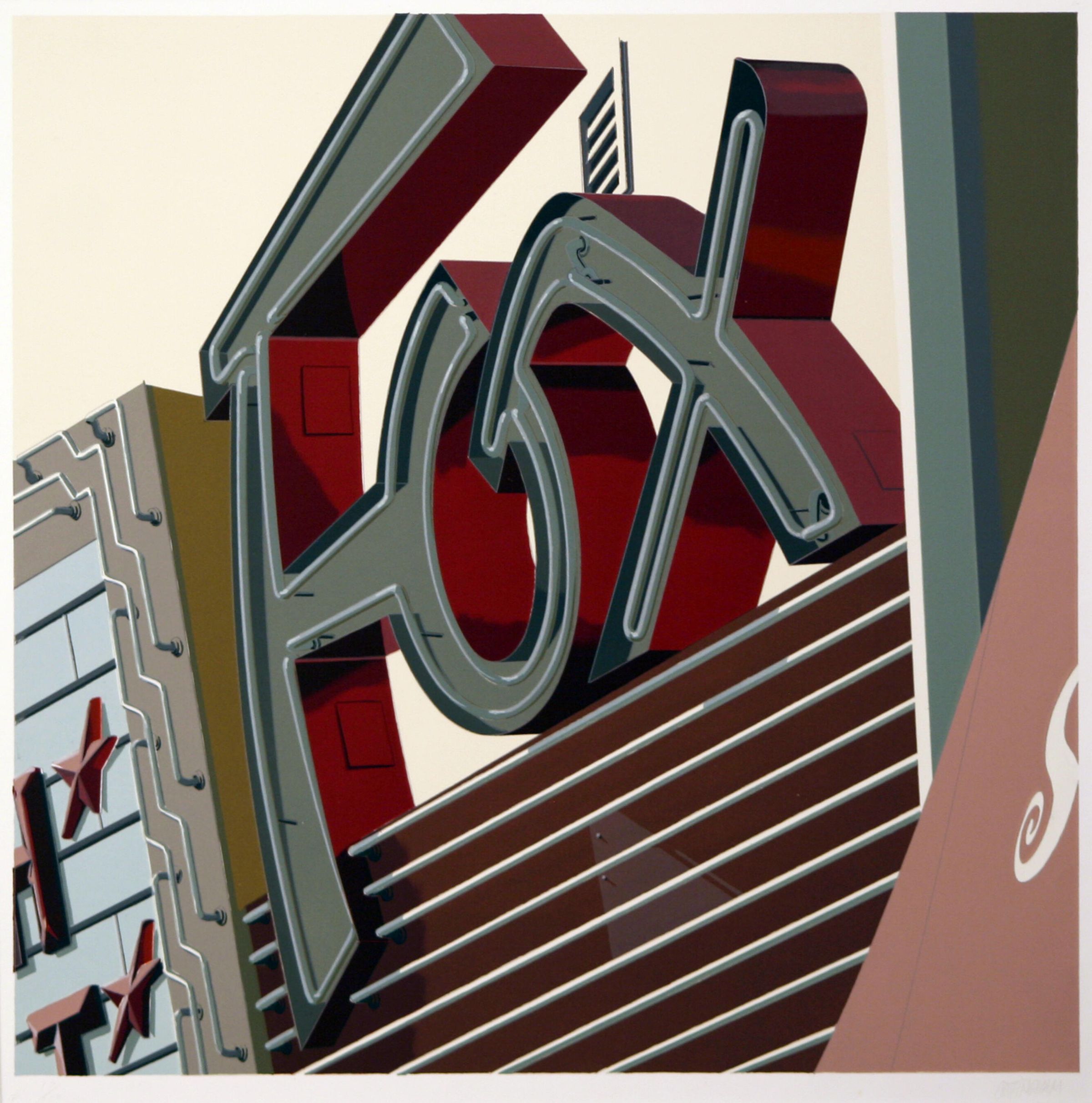 Founded in 1935, Twentieth Century Fox was and is one of country’s major film producers. It also owned a chain of movie theaters. In Fox, Robert Cottingham depicted a detail of the marquee of the Fox Theater in Inglewood, California. Cottingham was at the time living in nearby Los Angeles, and, like many Pop and Photorealist artists, he was enthralled with popular culture, especially the movies.