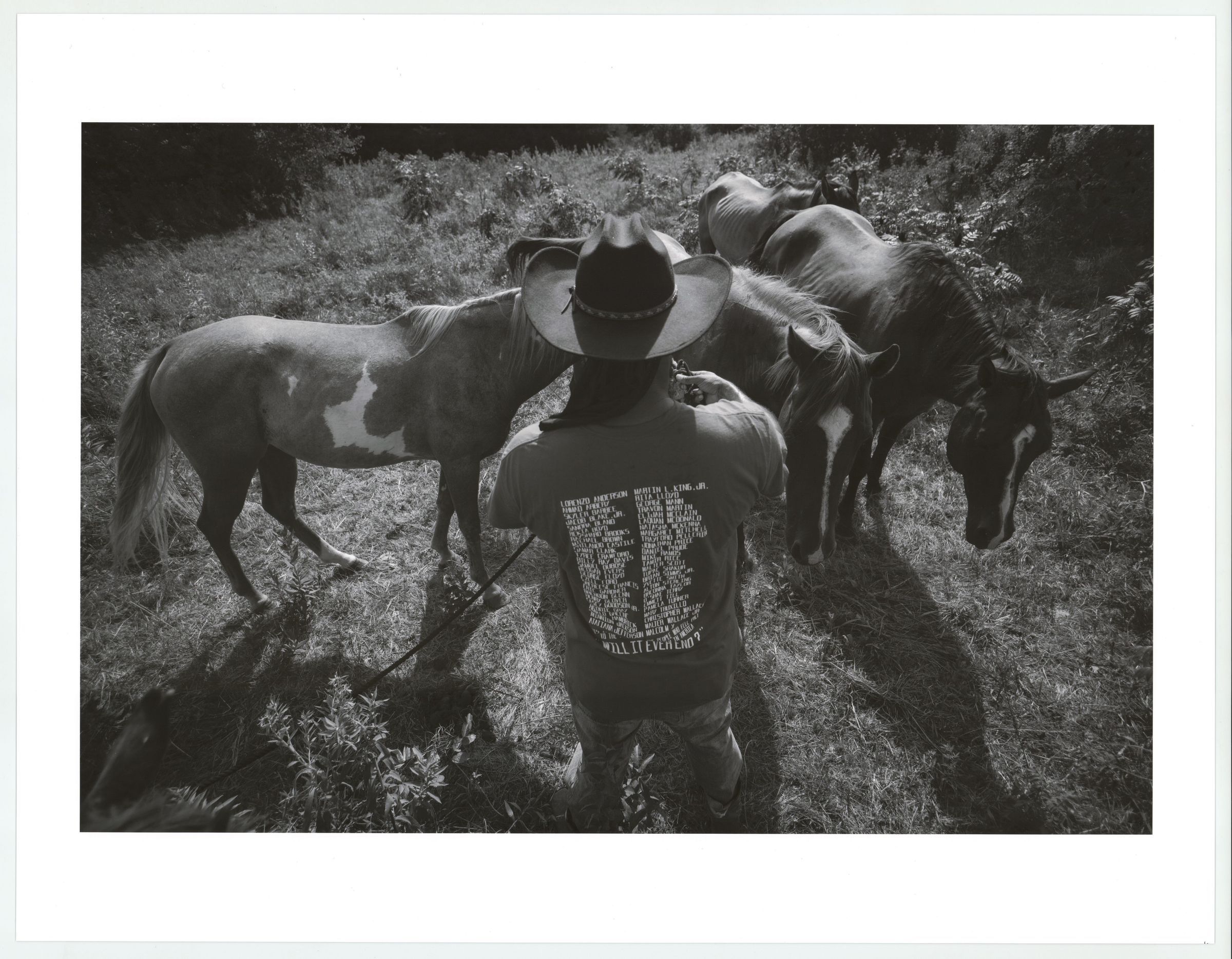 2024 post: Throughout 2024, we're looking back at the 100 year history of art at the Mulvane. This 2020 photograph is by Kansas-based artist Doug Barrett for his series "Ghost of the Plains." These works draw attention to the stories and legacies of Midwestern Black horsemen and farmers. In this photograph, a man named Chris prepares his horses to load up in the trailer. He wears a t-shirt with a list of 20th- and 21st-century Black Americans who were murdered, underscored by the statement, "WILL IT EVER END?"
