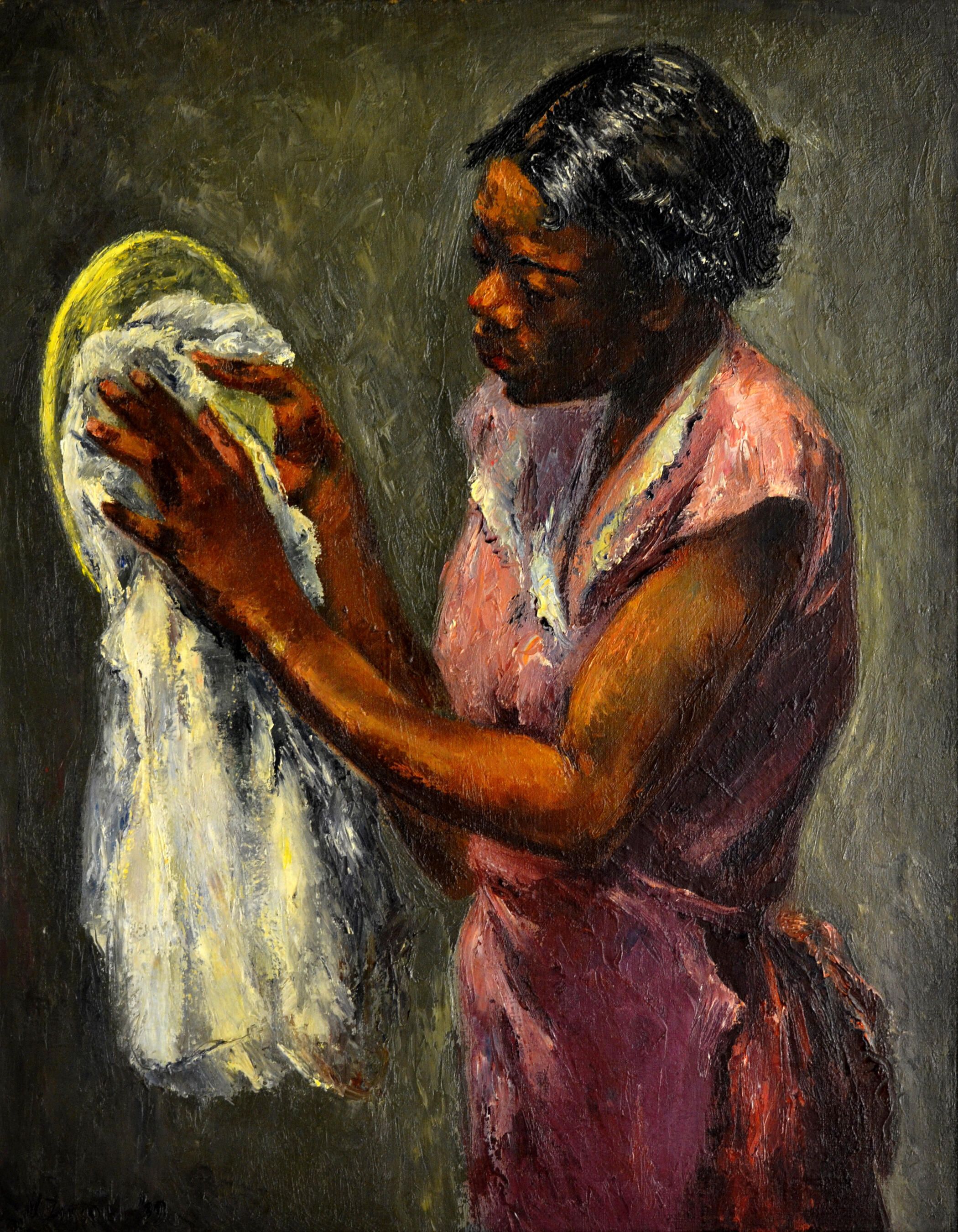 Throughout 2024, we're looking back at the 100 year history of art at the Mulvane. Read WU student Jackson Nicodemus's response to this 1939 painting: "30 Cents an Hour" depicts an African American woman washing and drying dishes for a meager wage during the Great Depression. The painting was made in 1939 by an Italian artist Nicola Ziroli through the Works Progress Administration. The artist’s choice of realism, including the details of the fingers holding the cloth and the look of concentration on the woman’s face, allows the viewer to connect with her on an emotional level. In addition, the shallow picture plane and the angle at which Ziroli depicts the figure make one feel as if they are sitting right next to her. This work provides a glimpse into the realities faced by African American women during the 1930s.
