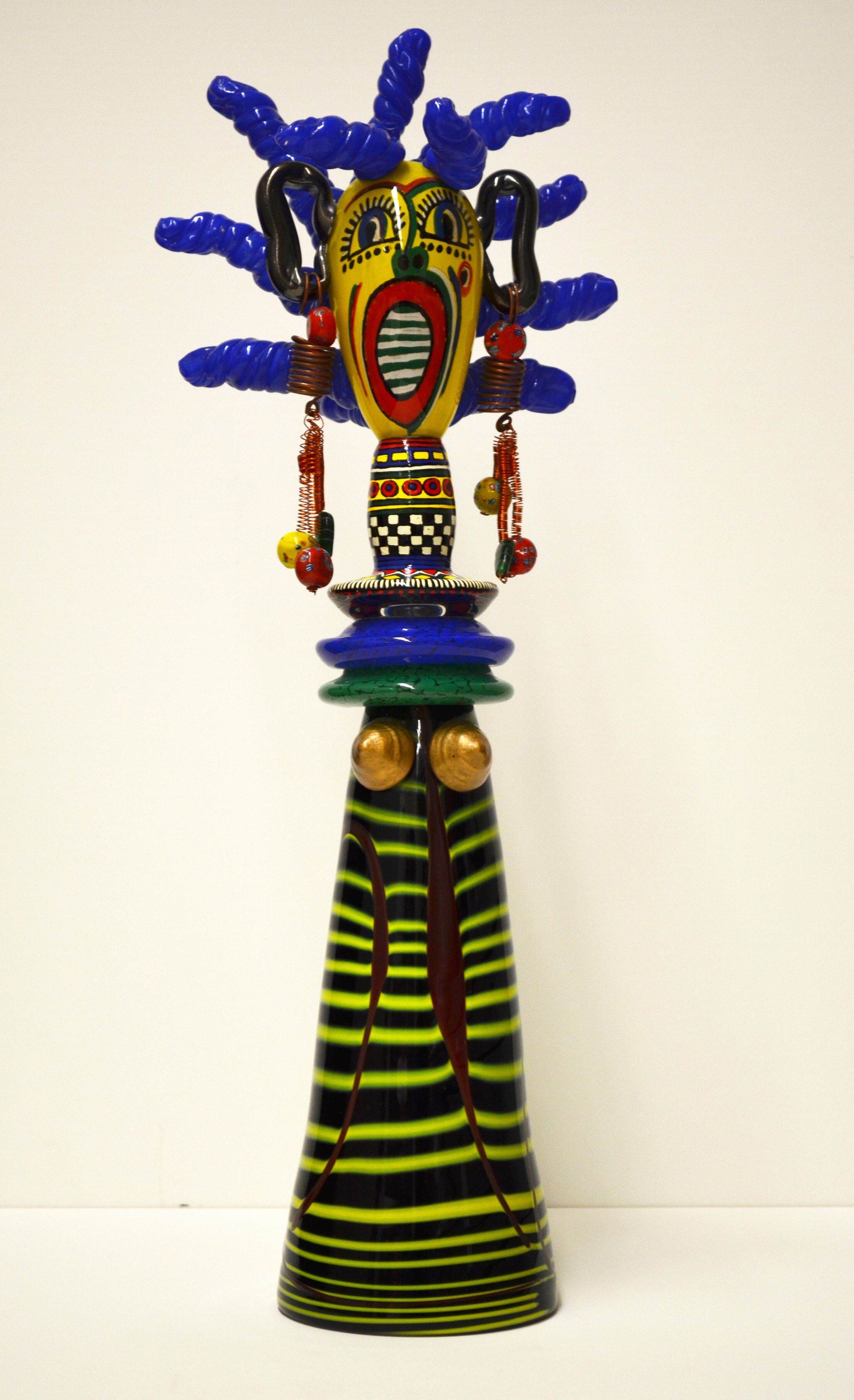 Gavin Heath has been creating his "tribal doll" or "Afro doll" blown glass sculptures since the early 1990s. He incorporates designs painted with glass emulsion (pulverized glass mixed with oils) on the work's surface and within its glass layers. The sculptures' form is influenced by the art of the Ndebele people of South Africa, as well as Italian glass artist Luciano Vistosi. They evoke ancient African goddesses and related figures.