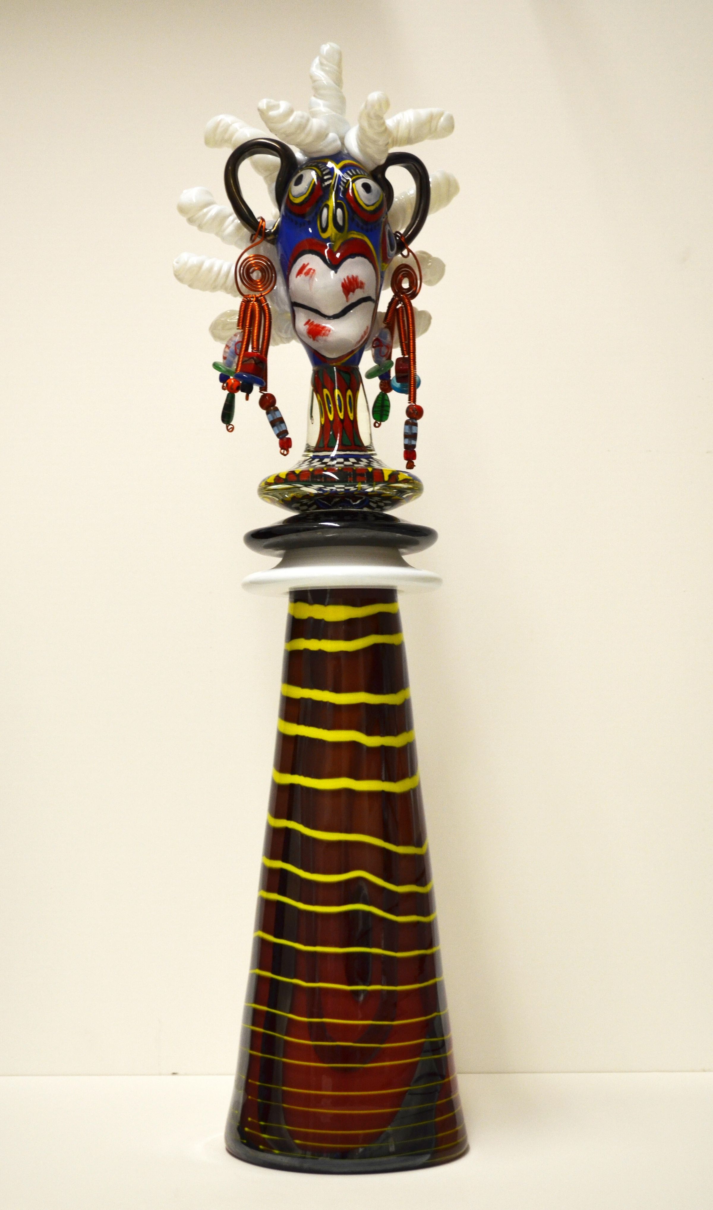 Gavin Heath has been creating his "tribal doll" or "Afro doll" blown glass sculptures since the early 1990s. He incorporates designs painted with glass emulsion (pulverized glass mixed with oils) on the work's surface and within its glass layers. The sculptures' form is influenced by the art of the Ndebele people of South Africa, as well as Italian glass artist Luciano Vistosi. They evoke ancient African goddesses and related figures.