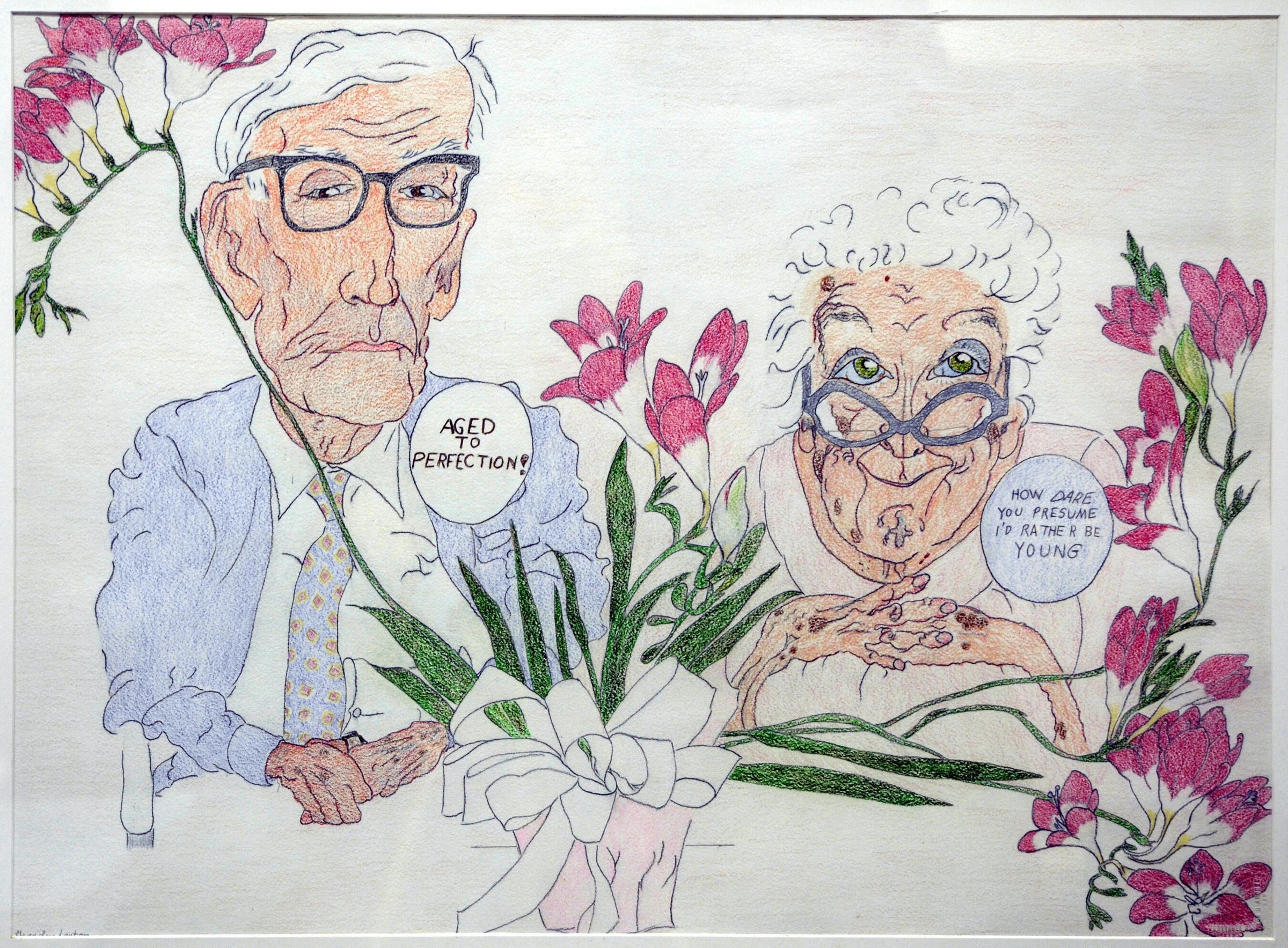 Throughout 2024, we're looking back at the 100 year history of art at the Mulvane. This 1990 drawing is by Kansas artist Elizabeth "Grandma" Layton. At 69, she took an art class at Ottawa University in Ottawa, Kansas. Over the next 15 years, she created hundreds of works that candidly explored personal subjects like her relationships, health struggles, hopes, and fears. "Aged to Perfection," a depiction of Layton and her husband Glenn, expresses her positive outlook on the process of becoming older.