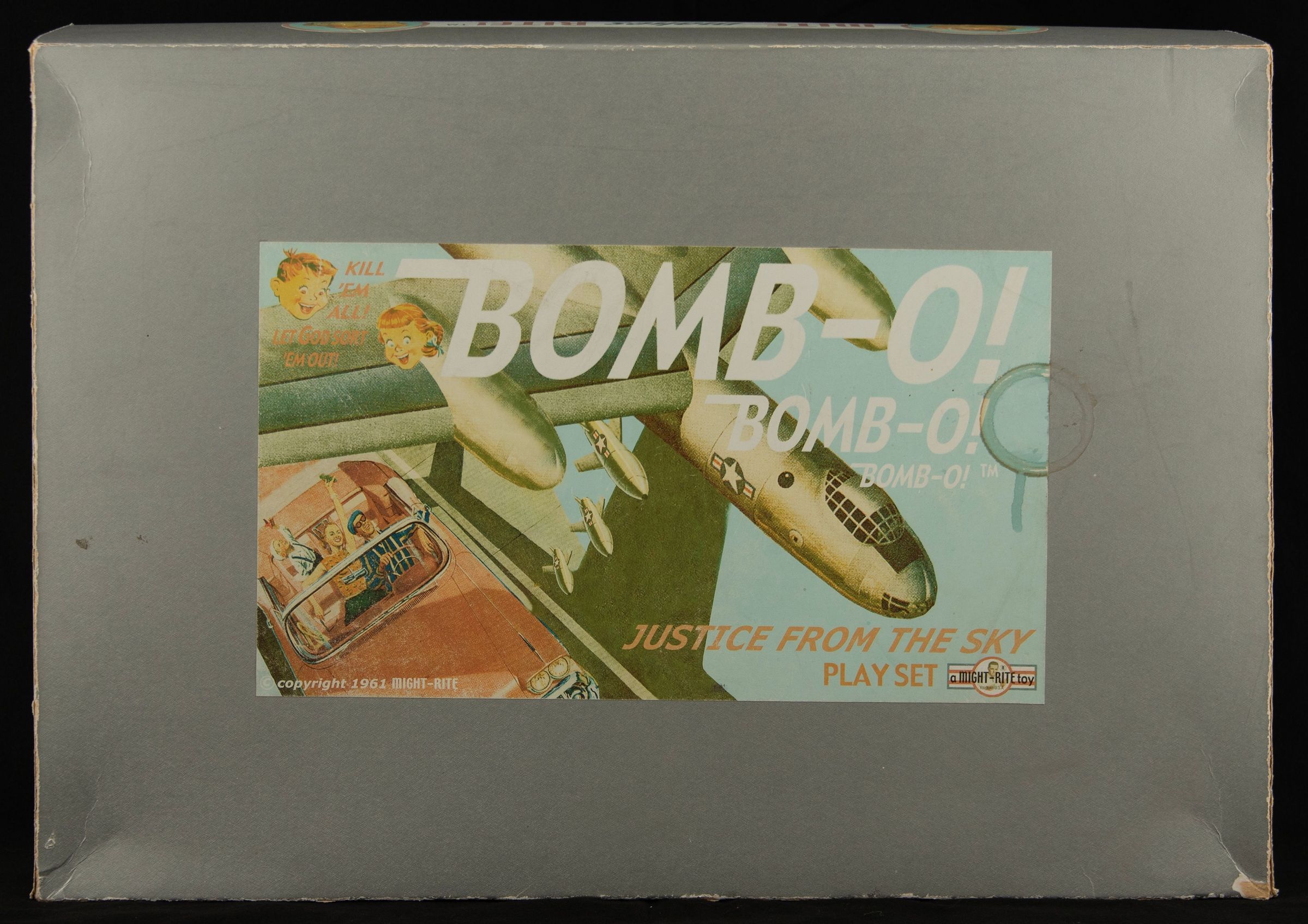 Bomb-O, Bomb-O, Bomb-O seems to be a relic from a different time. The design of this fictional playset is mid-century, but its subject is anachronistically cynical. The pessimistic message of violence and senseless destruction contrasts sharply with the visual reference to a time of patriotic optimism and ambition in the United States.