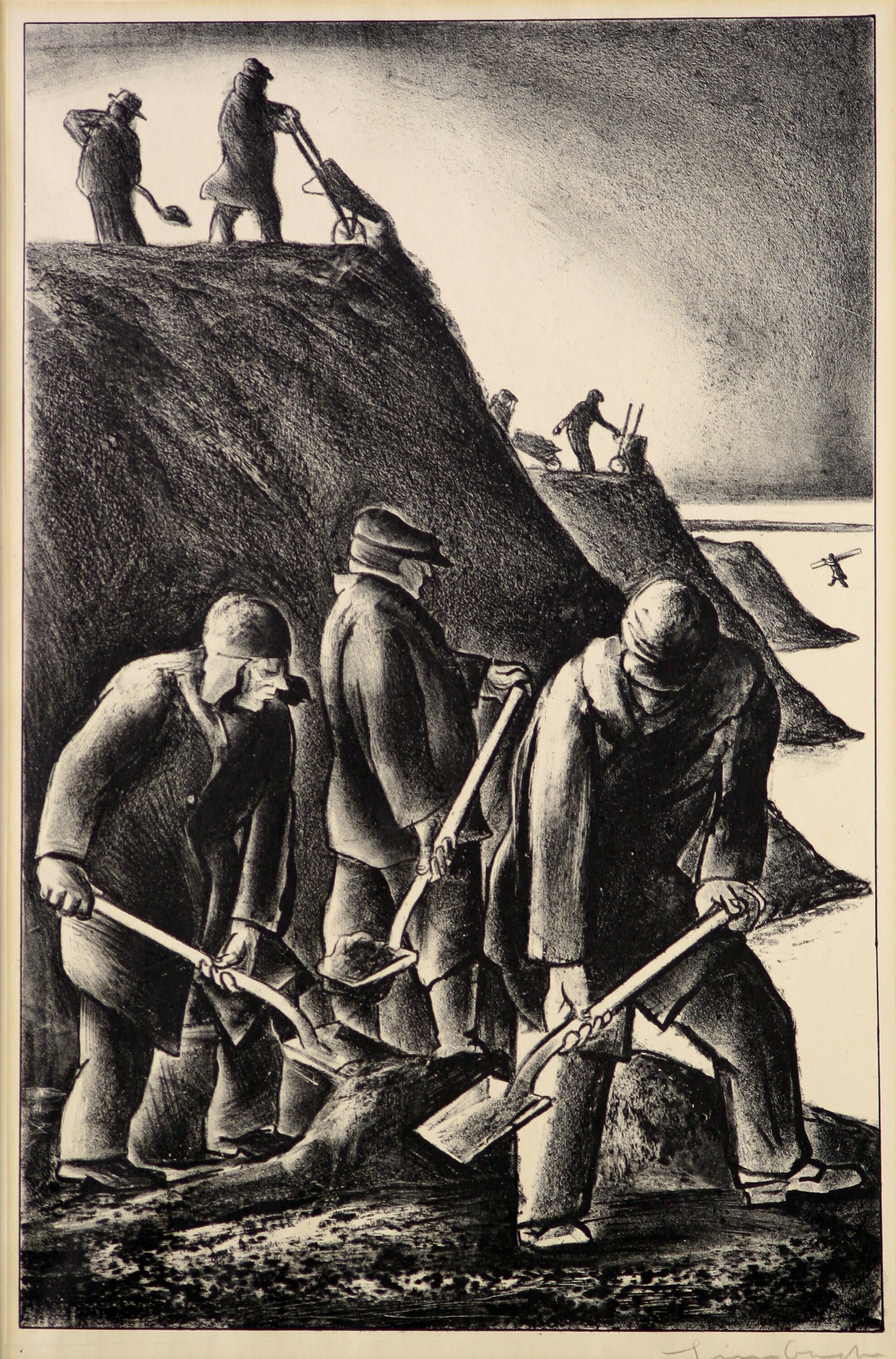 CWA stands for “Civil Works Administration,” a short-term job creation agency that provided construction work for unemployed Americans during the Great Depression. Limbach depicts three sturdy men standing in the foreground, shoveling dirt along the water. In the background, smaller men in profile appear to be depositing the dirt atop two hills, perhaps building a levee. The details of their faces are not visible, putting more focus on the labor of their bodies. As we can see here, they are hunching over, emphasizing their strength while working together to improve America’s infrastructure.
