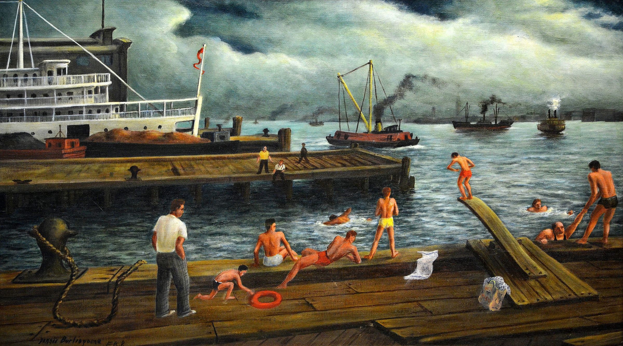 This work depicts a group of masculine-presenting individuals surrounding themselves only with those that seem to share their interests and dress in a similar way. The scene references gendered exclusion that often occurred during this period in which many people would only welcome those that looked and acted as they did.
