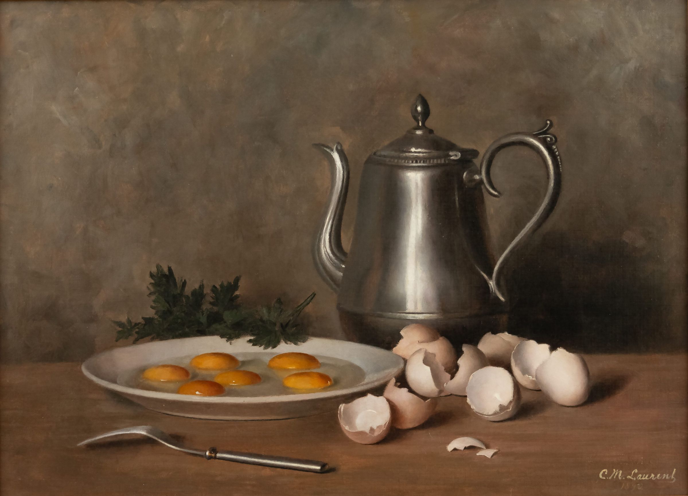 Eggs was among several paintings by Topeka artist Clarisse Madeleine Laurent that were displayed at the 1904 Louisiana Purchase Exposition. Like many of Laurent’s works, it demonstrates careful attention to detail and skillful paint handling, resulting in the polished, illusionistic rendering of this still life.
