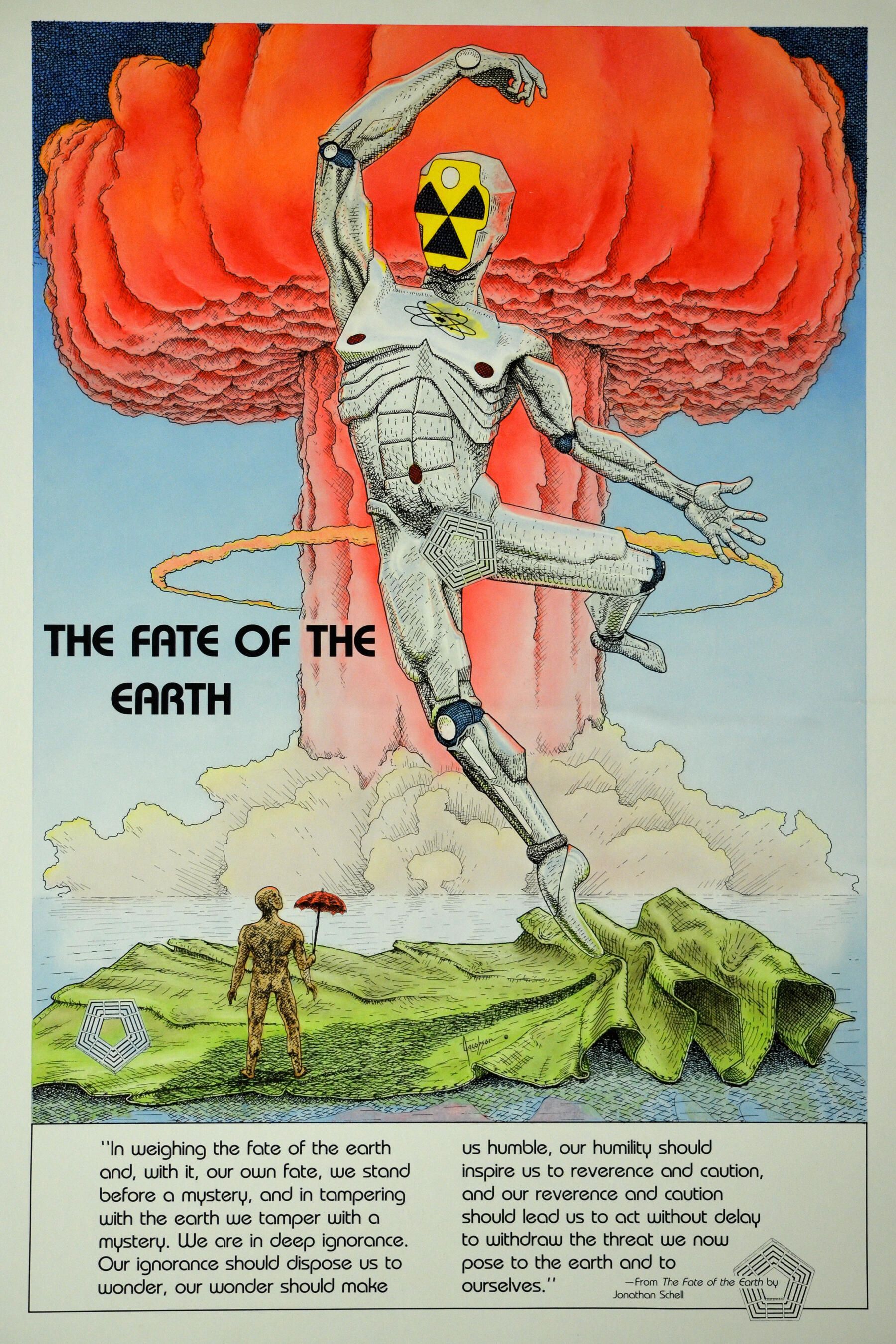 Duck and cover! Get your umbrellas out! A nuclear bomb just went off! The lithograph pictured here was created by Michael Jacobson in 1985 while attending Washburn University. It depicts a large silver cyborg standing over a small gold cyborg holding an umbrella. The quote below the image is by Jonathan Schell, from his book The Fate of the Earth, which is an abstract discussion of survivability and balance of power during nuclear proliferation and consequences humanity would face. The earth under the silver cyborg (representing nuclear destruction) is being swept away, while an atom bomb explodes in the background. In the style of a political cartoon, this artwork illustrates Schell’s warning that if we continue to allow nuclear proliferation, not only mankind, but also the earth, may face annihilation. Both Schell’s book and this artwork challenge humanity to choose disarmament before it is too late.