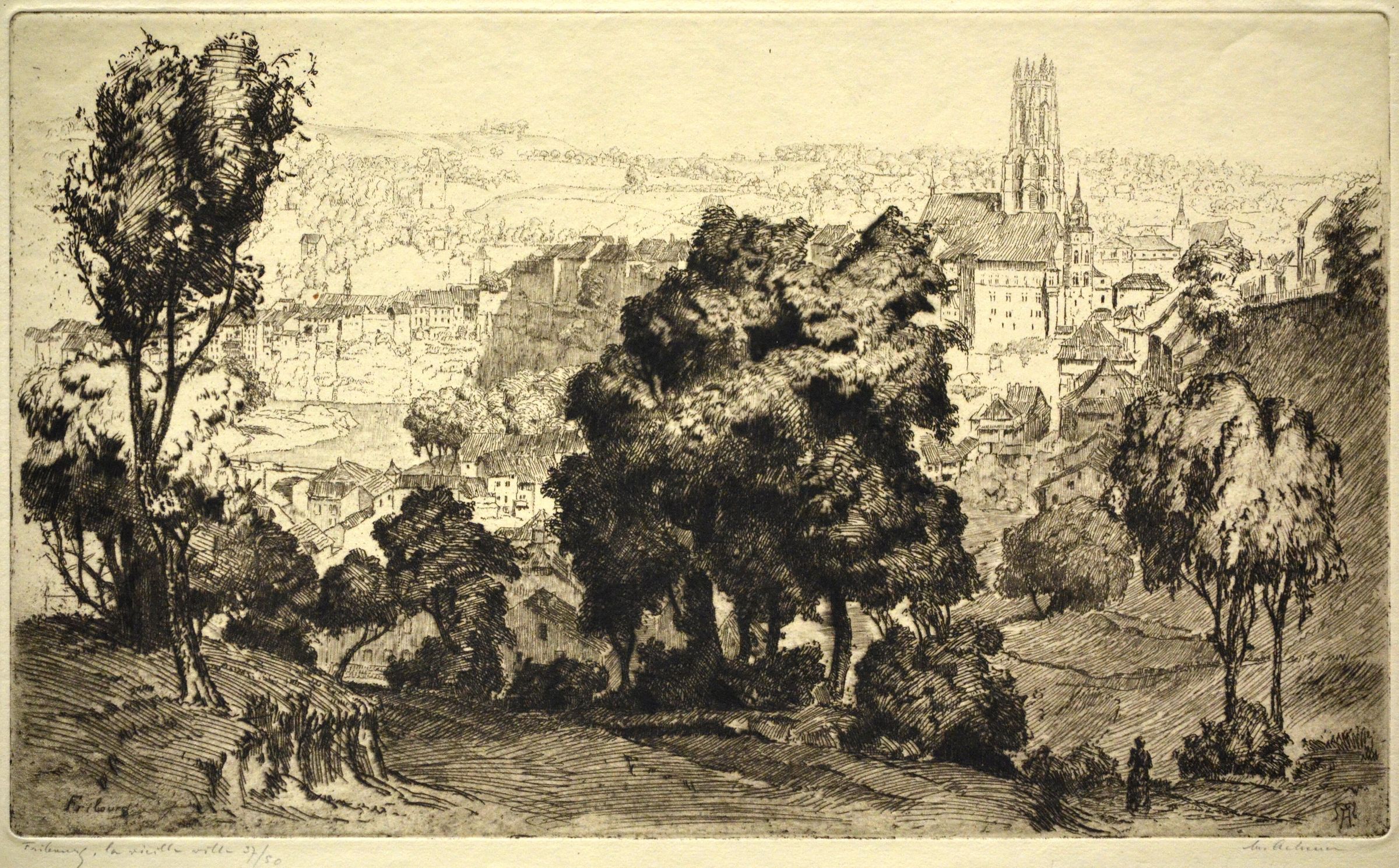 In the foreground a traveler walks down into the old Swiss city of Fribourg, which is dominated by the tower of a Late Medieval/Gothic church. Achener worked frequently in Switzerland both before and after WWI.