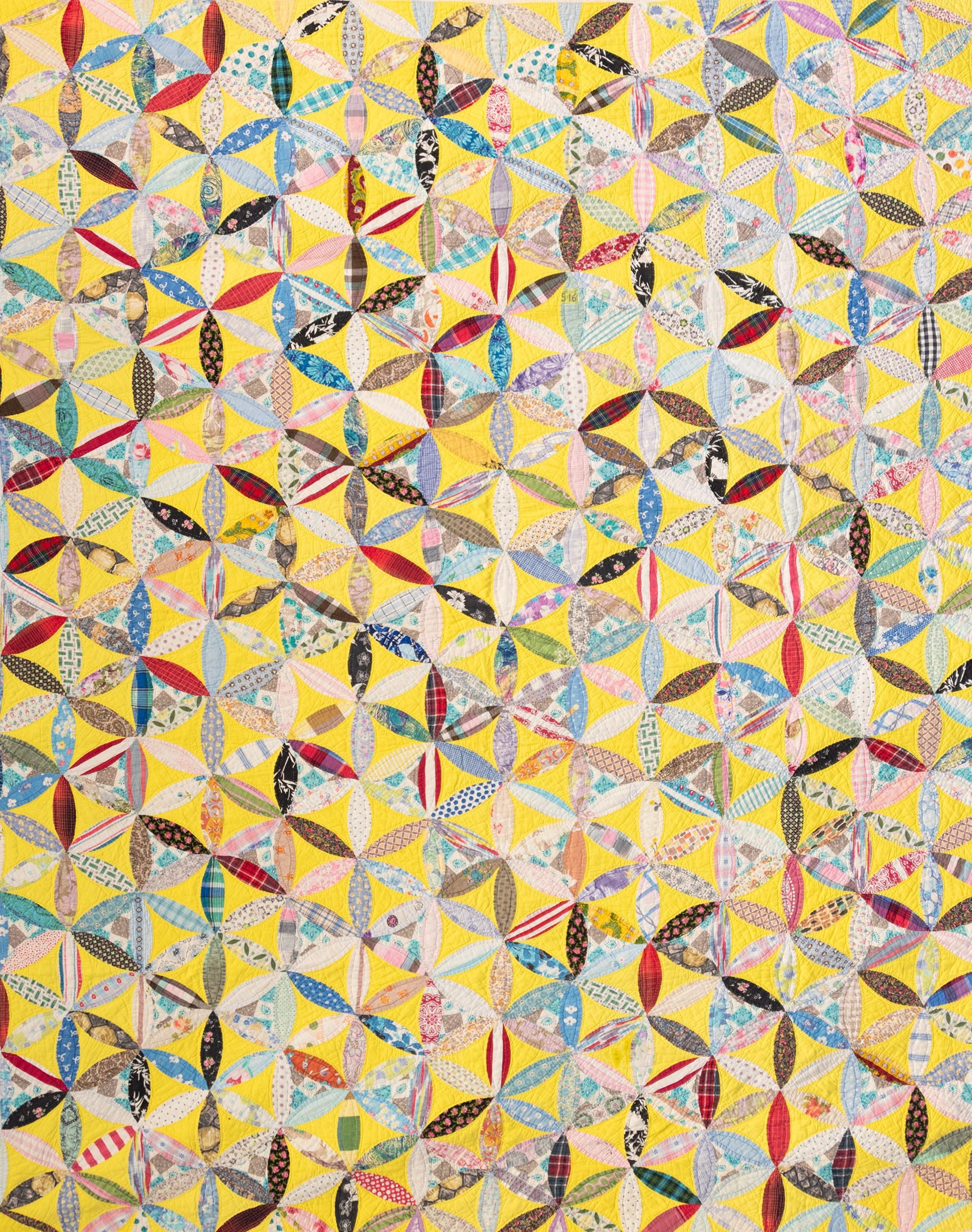 Throughout 2024, we're looking back at the 100 year history of art at the Mulvane. This circa-1940 quilt came into the collection as part of a donation from the Kansas Quilt Project. Made in Nickerson, Kansas, it utilizes bright pieces of fabric to create the "Joseph's Coat" pattern, sometimes also called "Orange Peel" or "Mosaic Window."