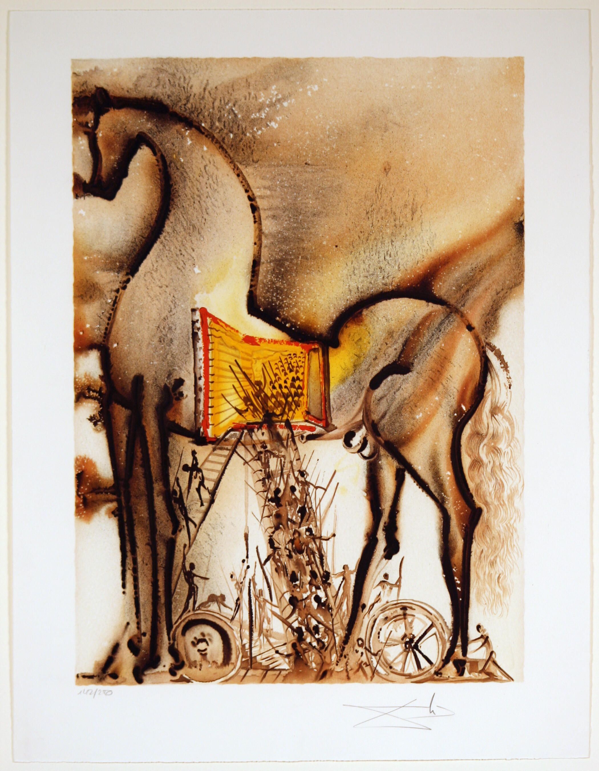 Dali’s depiction of the Trojan Horse has an ominous look that suggests the looming deaths of those who resist the Greek navy and army. The work has a classical feel that comes from older styles of art in Ancient Greece's history. It shows the soldiers from Greece coming out of the Trojan horse and getting ready to attack Troy’s army and citizens. The only parts of the painting that do not have dark colors are under the Trojan Horse, highlighting the opening where the soldiers are coming out. This could suggest their future victory against the Trojan army.
