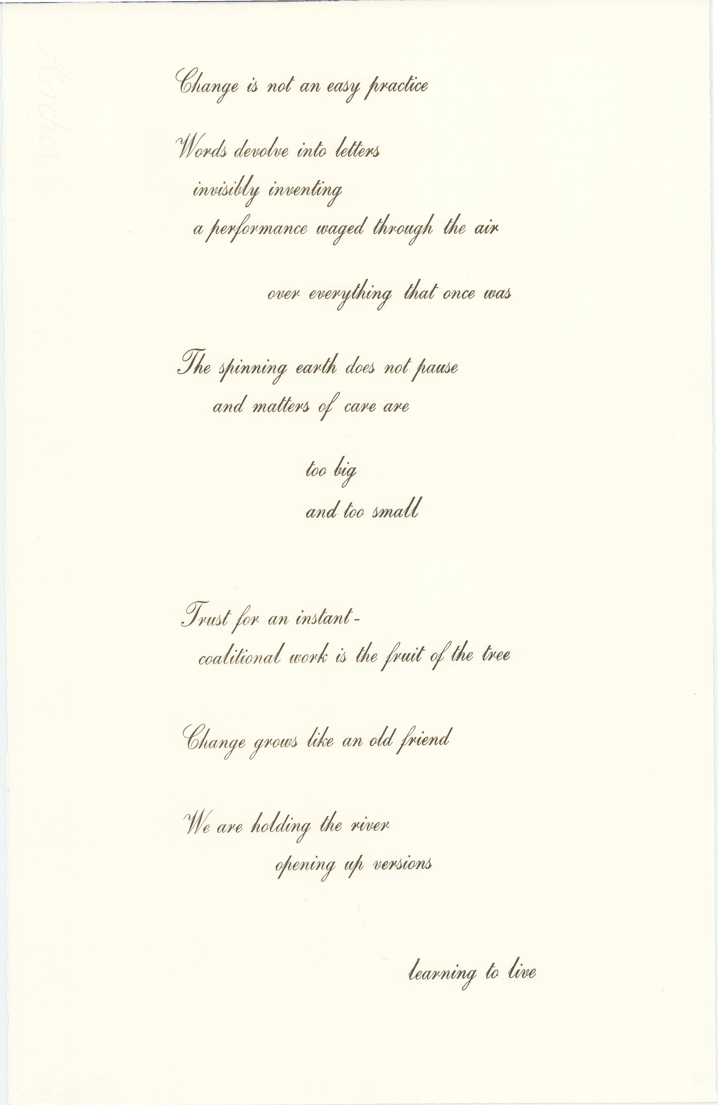 We are living in precarious times. The ten letterpress prints of this portfolio are written as epistolary poems, speaking—and listening—toward our possible futures. As the letters seek to make clear, discerning how to change our ways of being will involve care-full listening, not only with our ears but also with our hands, our bodies, our gestures, to shift our human and more-than-human relations. "Listening Toward Our Futures" is created as part of a larger project of listening as artistic practice. The unbound pages are housed in a portfolio folder built by the artist.