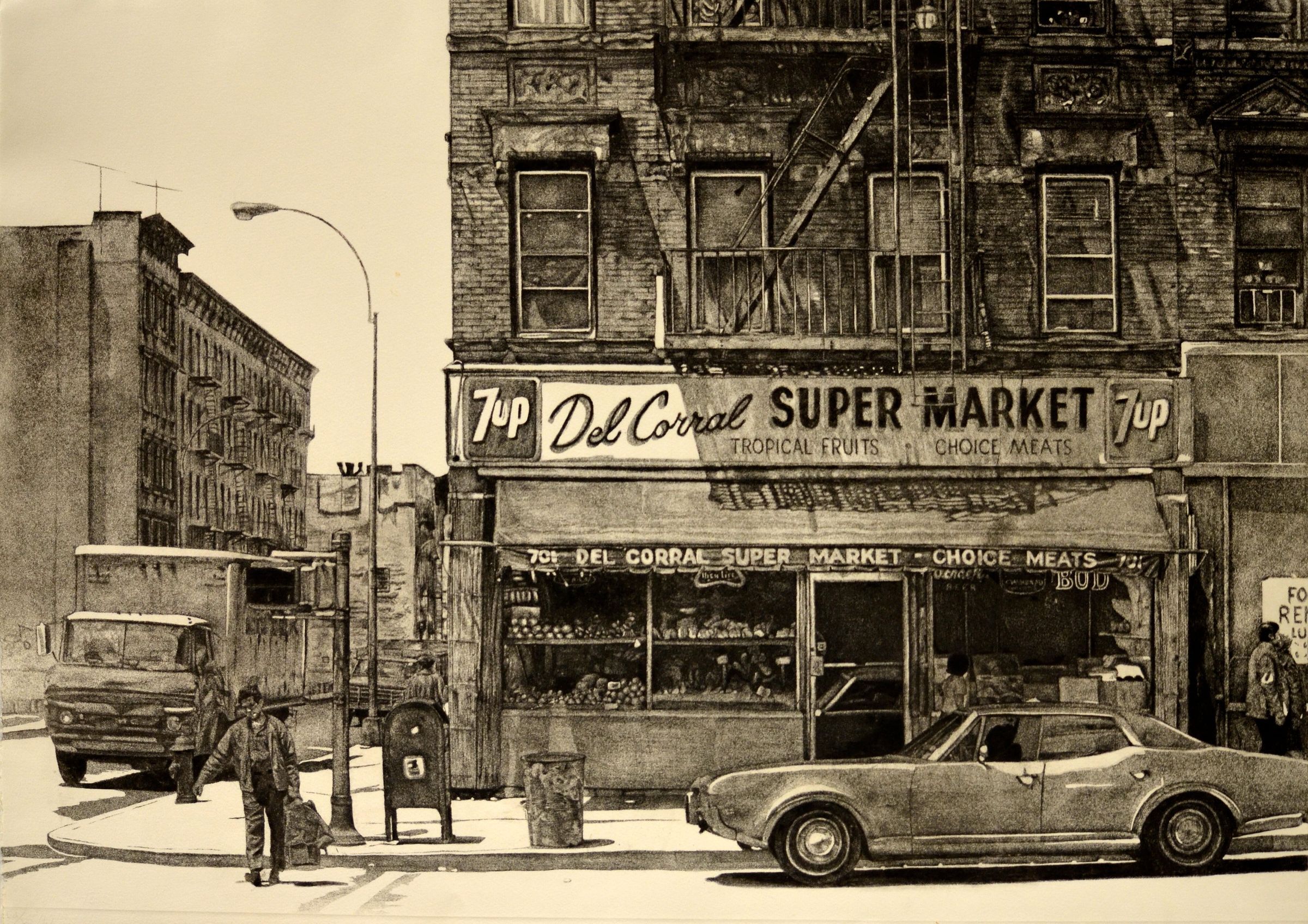 Kirk’s use of black and white in depicting the scene on Ninth Avenue gives some sense of peace to what could be considered a stressful and disheartening situation.