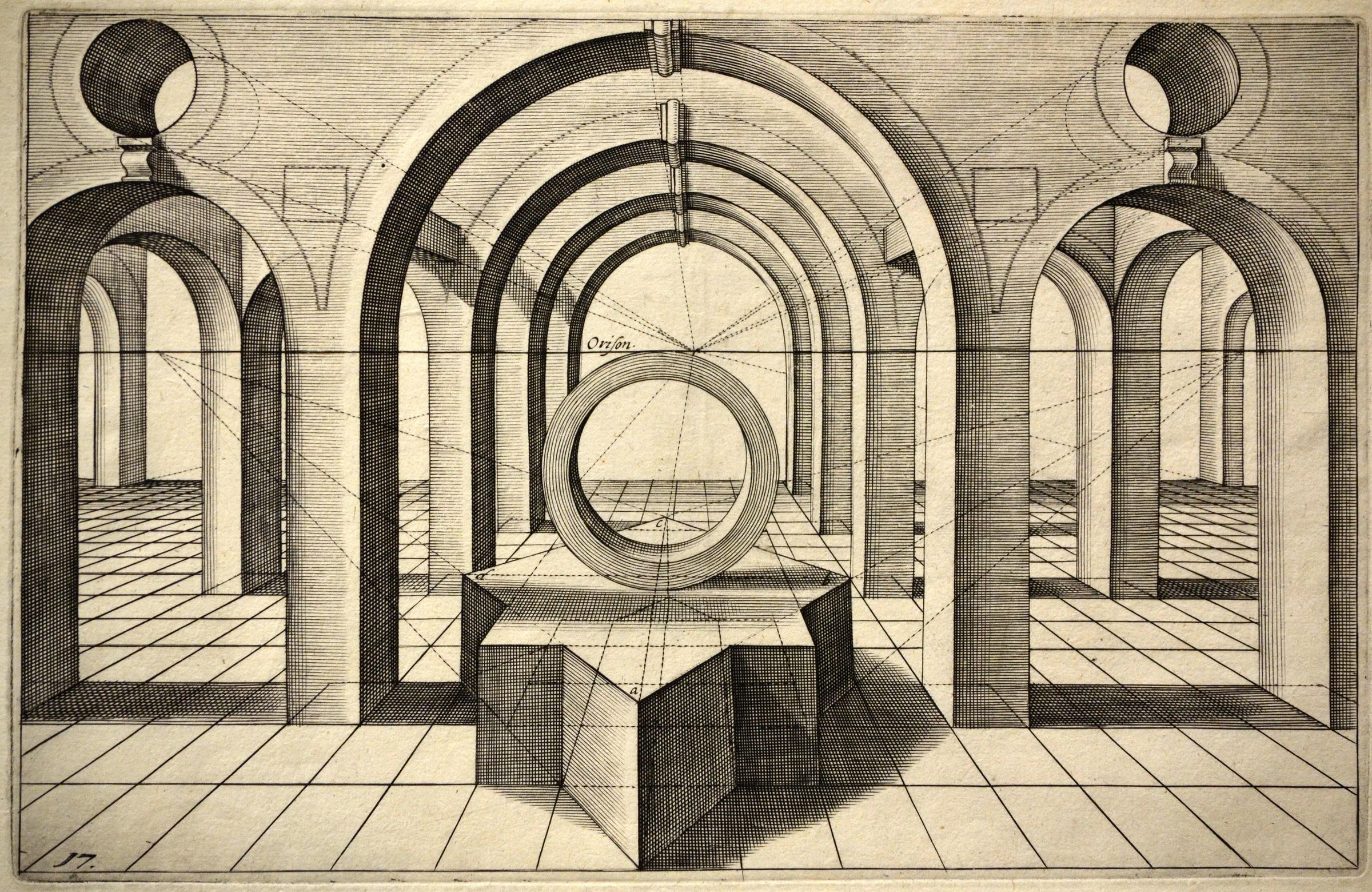 When humans look into a distance, lines that are parallel in nature, like floor tiles, appear to converge. This principle, called scientific perspective, was discovered in Florence, Italy, in the early 15th century. Perspective fascinated Renaissance artists, and many studied it. Vredeman de Vries was an internationally known expert in perspective.