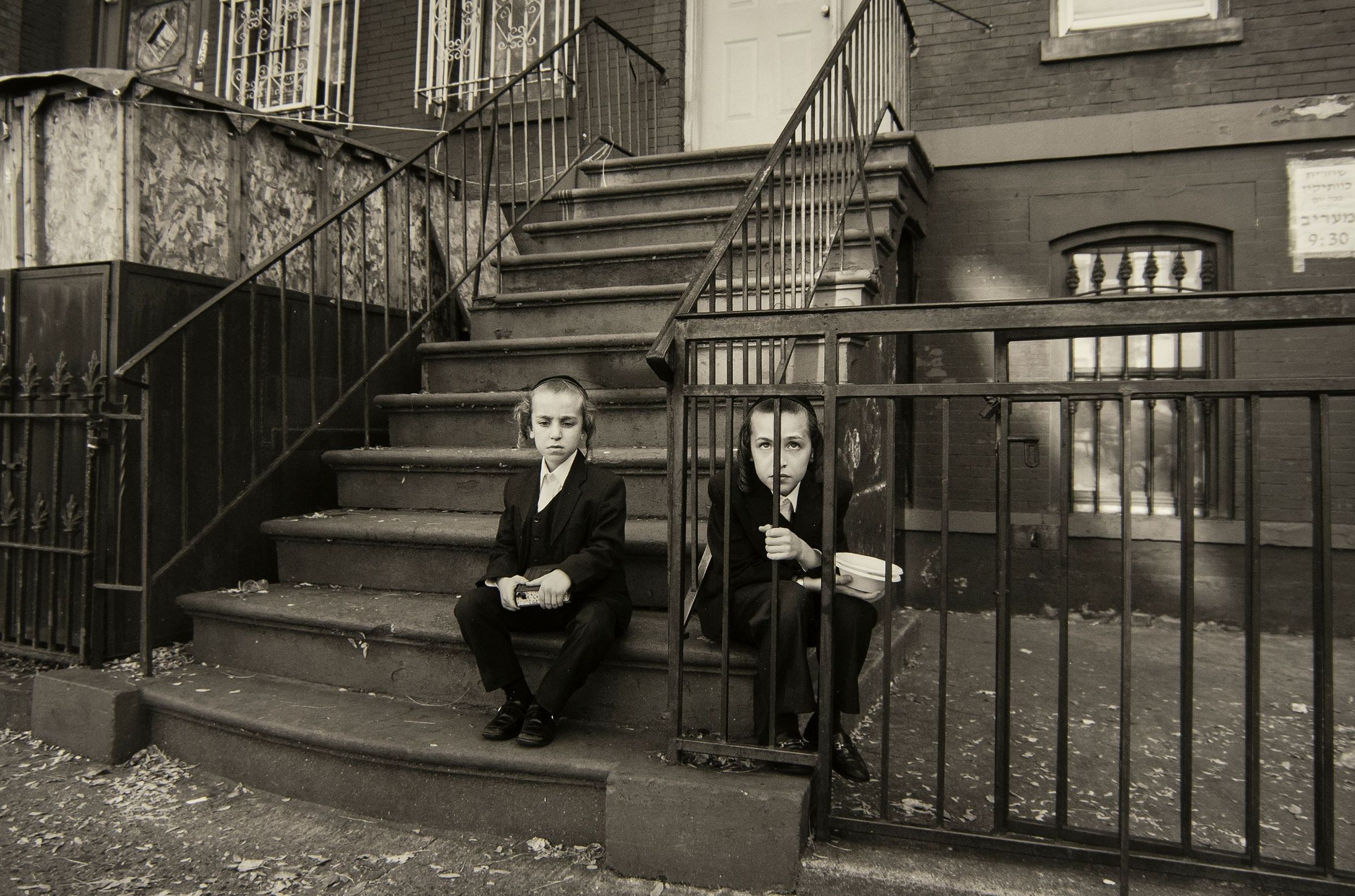 William Castellana’s work of two Hasidic Jewish boys sitting on a staircase in their neighborhood in Brooklyn was strictly an outsider view into their lives. One of the boys is holding a bowl, the other a book. Their curls and yarmulkes distinguish them as Hasidic, and their dress indicates an event or service of some kind. Despite their formal clothing, they find rest where they can. These children reclining on a stoop provide a familiar feeling of relaxing while waiting for a friend, a parent, and so on. The sense of patience and waiting is palpable, yet the desire to sit for a minute cannot be ignored.