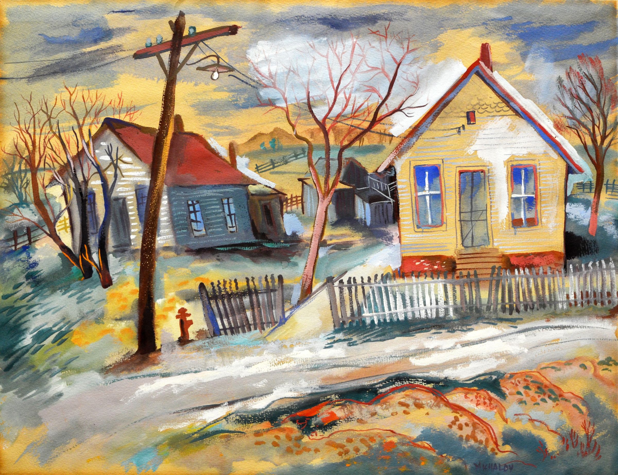 Throughout 2024, we're looking back at the 100 year history of art at the Mulvane. This painting by American artist and instructor Anne Michalov was made in the 1930s or early 40s. Michalov was commissioned by the Works Progress Administration to create art during the Great Depression. She made lithographs, murals, and paintings, including "Two Houses."