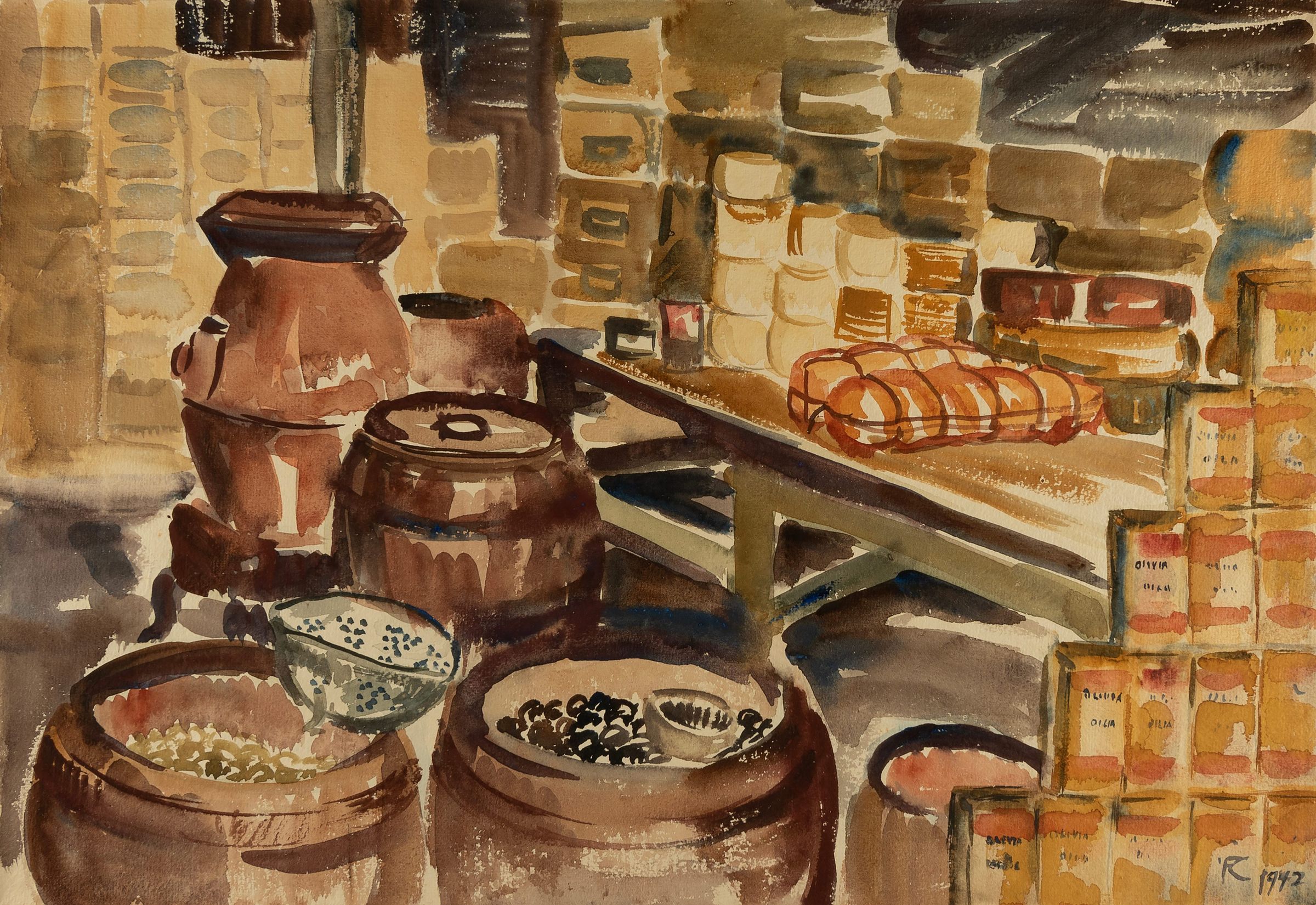 Based on an inscription on the back of the painting, this watercolor depicts a scene in the “Spaghetti District,” a neighborhood in the French Quarter of New Orleans where Sicilian businesses produced dry pasta. When Kansas artist Fern Cooper created this picture of overflowing abundance in 1942, the U.S. economy was just getting back on its feet after the devastation of the Great Depression. It signals hope that the promise of America as a land of plenty would bear out.Label