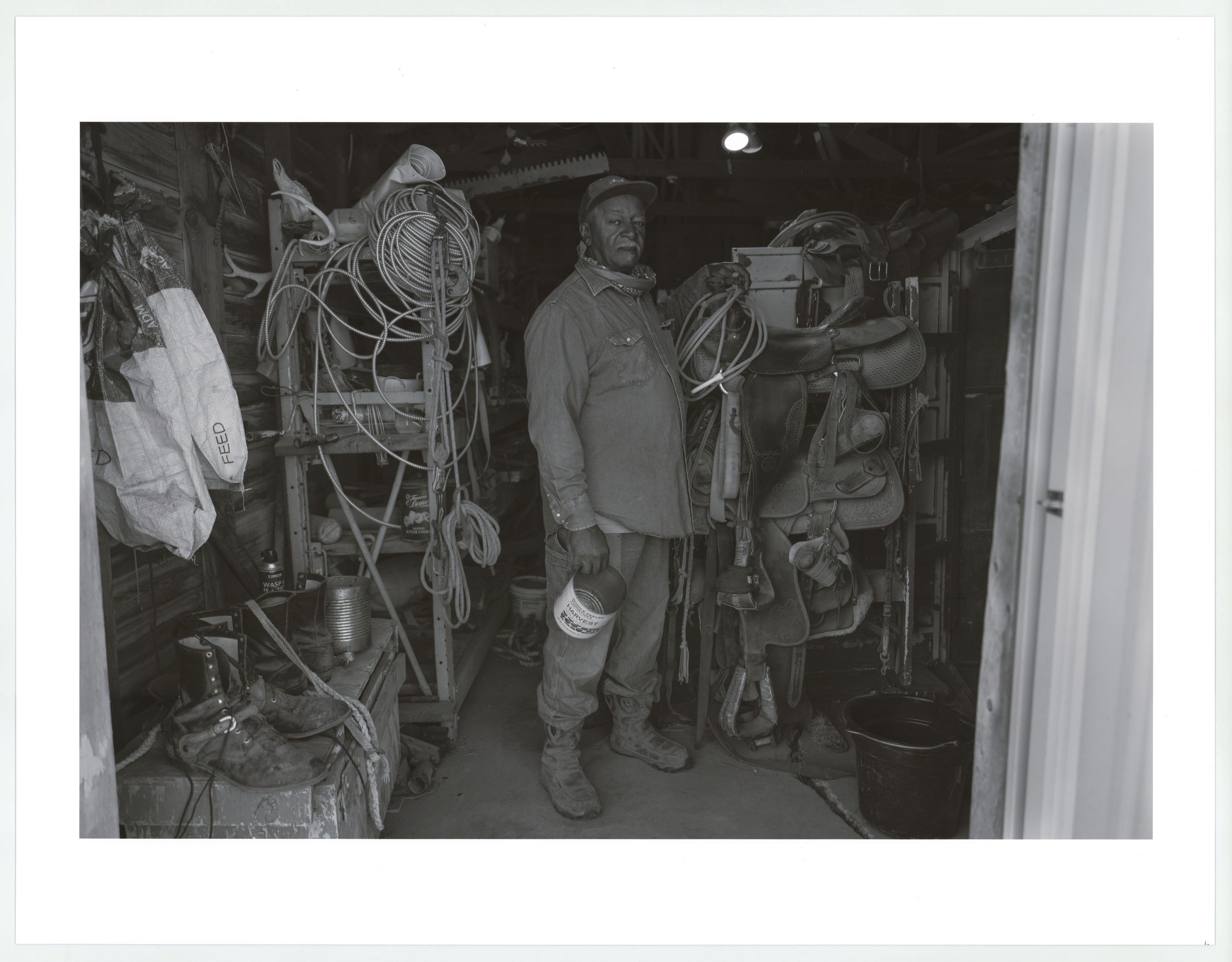 Carlos Walker poses for a portrait standing on his property in his tack room.Label