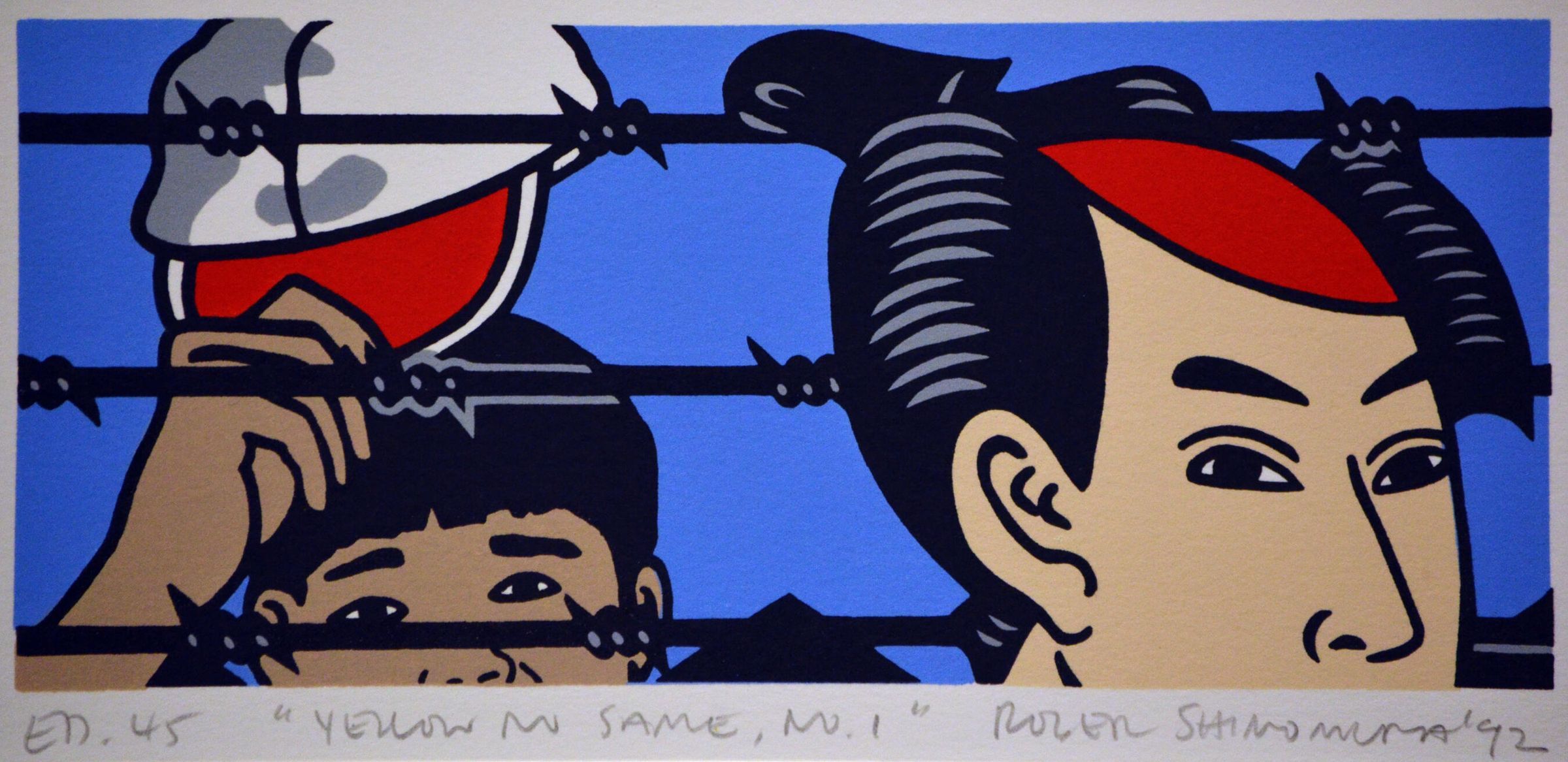 Titled "Yellow No Same" the works in this exhibition illustrate the double-sided prejudice on the part of many Americans which presumes that, while all Asians are either the same or indistinguishable from each other, all Asian-Americans are not the same as other Americans. Each of these images represents memories from Shimomura's experience as a young child when he and his family, along with other Japanese-Americans, were interned in the Minidoka camp in Idaho during WWII. Separating the figures are lines of barbed wire silhouetted in black. Shimomura's art reflects the artist's fascination for the comparison of American and Japanese cultures. "To most non-Asians in this country, the differences between the Japanese, Chinese and other Asian people are either indistinguishable or immaterial. During World War II this insensitivity was expressed by their failure to recognize the differences between the Japanese people and Americans of Japanese descent. Today, history is being formed to admit the gravity of this error in judgment-Yellow No Same."Label