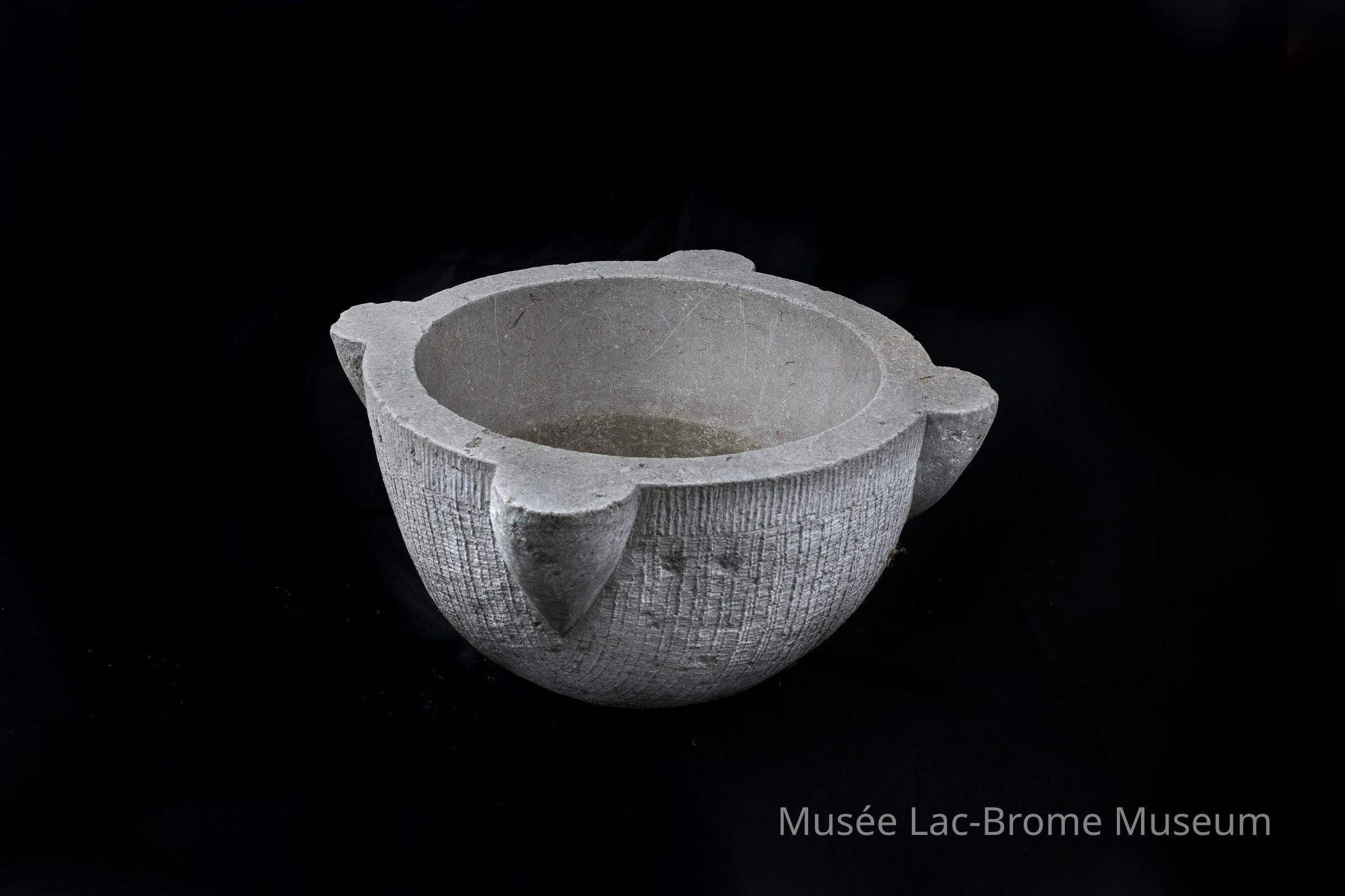 A large, heavy stone bowl or vessel. There are four protruding knob elements and vertical hand chisel marks around the outside of the object.