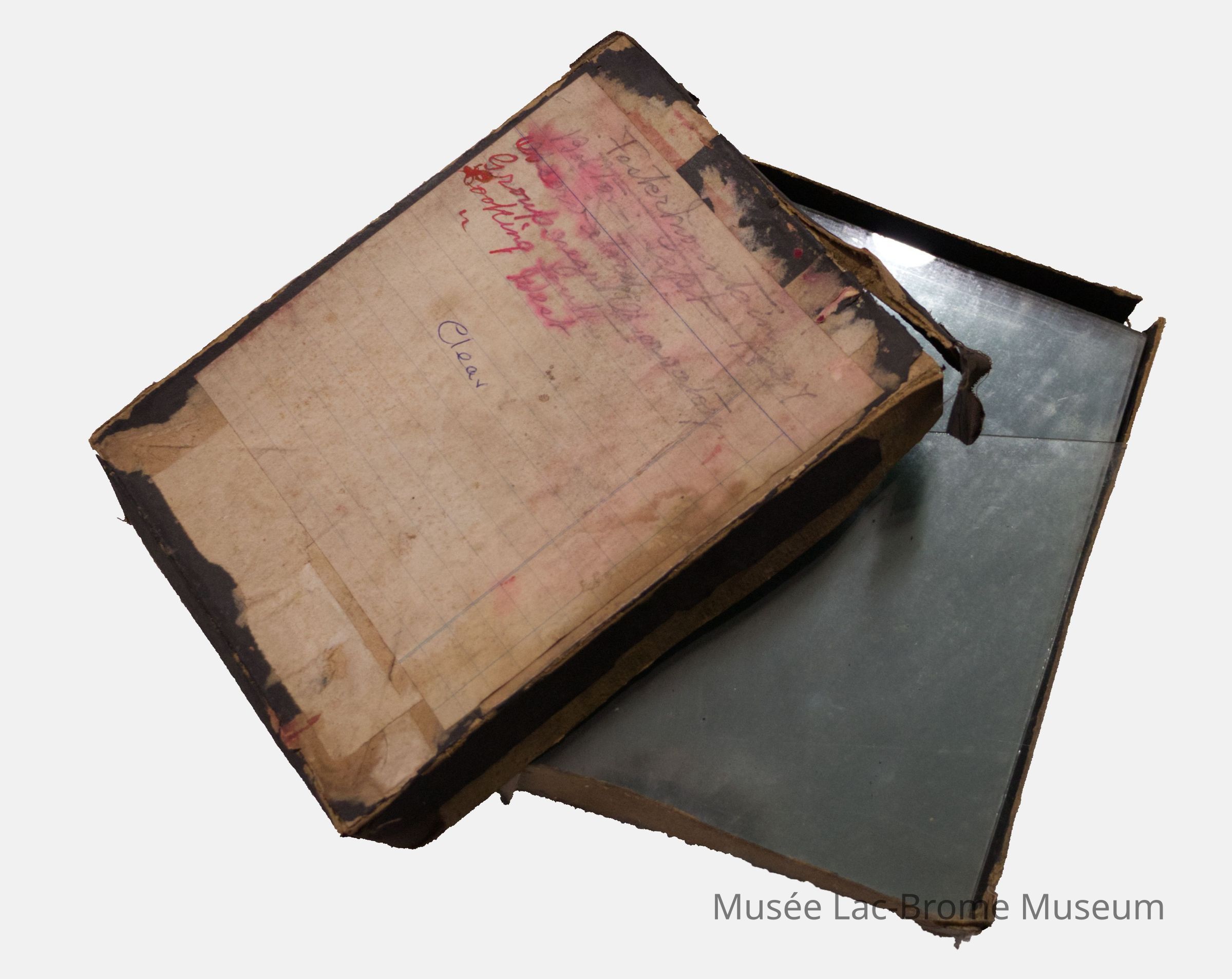 Cette boîte contient des plaques de verre vierges qui auraient appartenu à Sally Wood, une photographe de la fin du XIXe siècle. Cette boîte, ainsi que plus de 300 négatifs sur plaques de verre, aurait été trouvée dans un cottage situé sur Eagle Island dans les années 1950. D'après le nombre d'étiquettes apposées sur le couvercle de la boîte, il est clair qu'elle a été réutilisée plusieurs fois pour ranger des négatifs sur plaque de verre. L'étiquette la plus récente indique qu'elle a été utilisée pour la dernière fois pour ranger des négatifs photographiques associés à l'excursion de 1897 au poste d'observation des incendies, qui était autrefois situé sur le mont Foster à Bolton.Collection