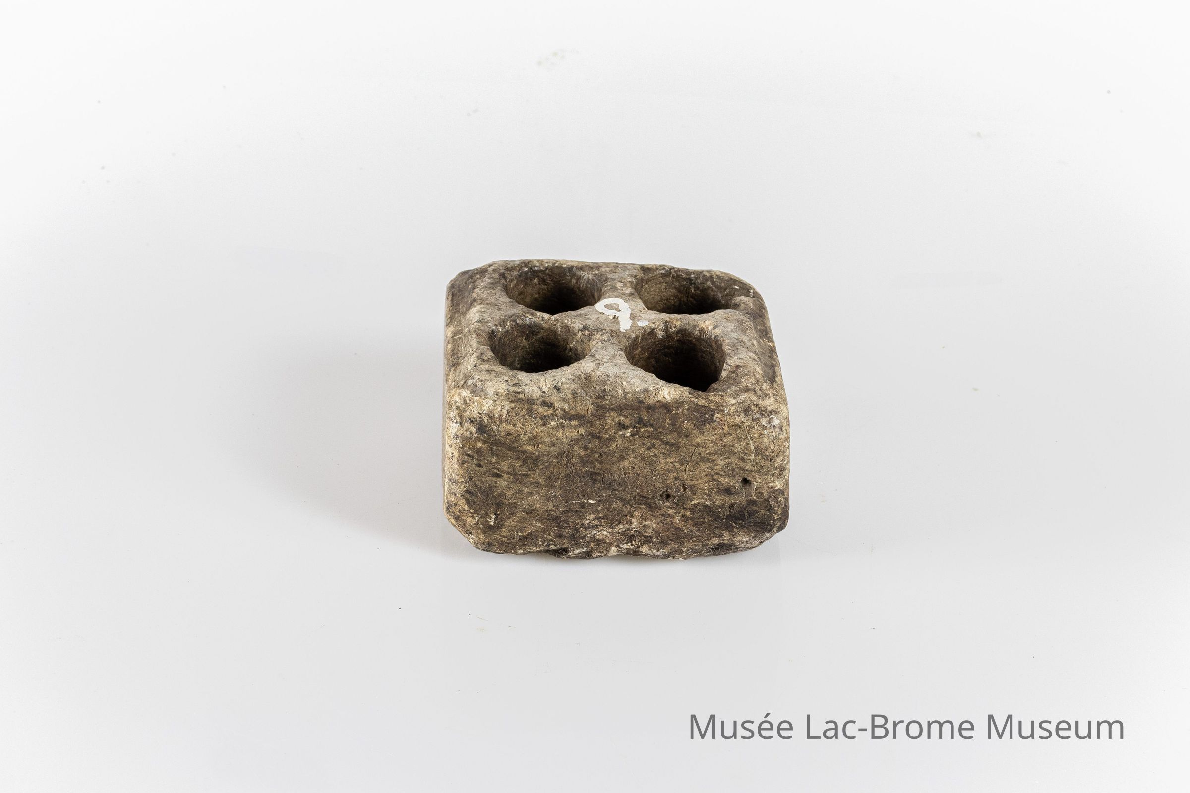 Une petite pierre carrée gris-brun avec quatre trous circulaires.Context