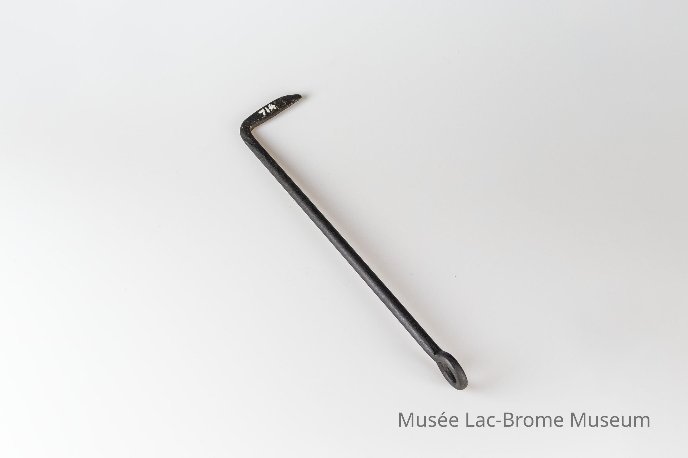 Ce tisonnier est constitué d'une tige métallique noire munie d'un anneau à une extrémité et dont l'autre extrémité est courbée.Context