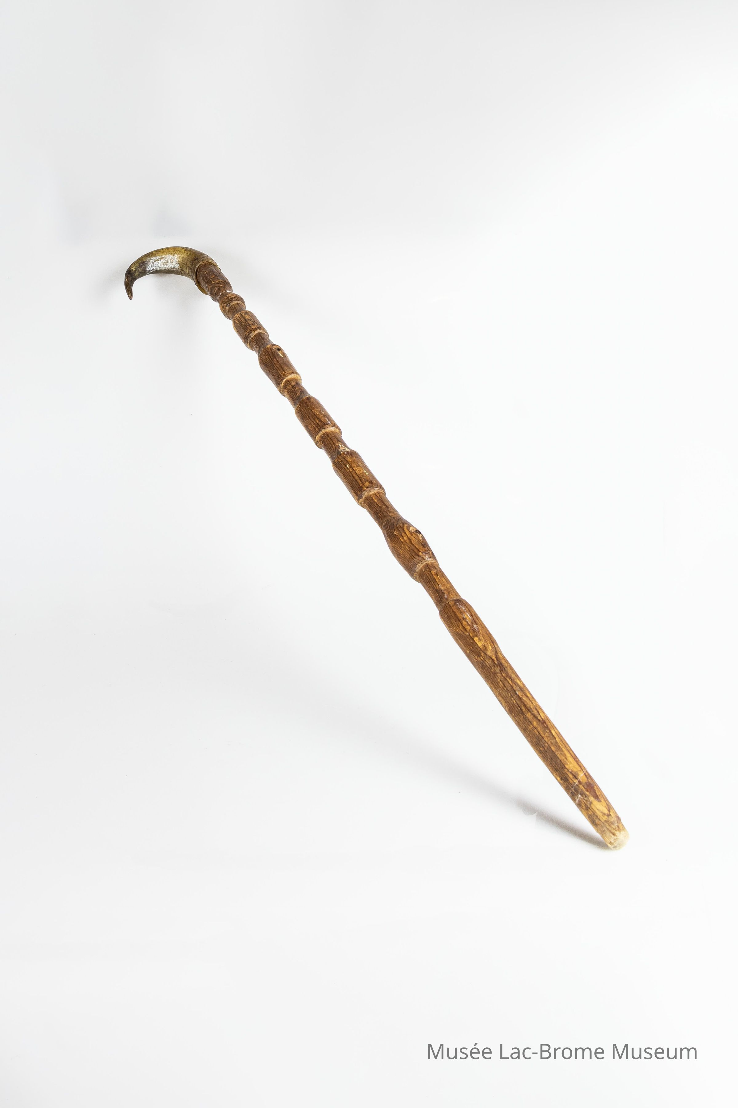 Une canne avec des entailles sculptées dans le bois afin que son épaisseur varie. Le manche de la canne est en corne animale. Le bas a été arrondi à force d'être utilisé.Context