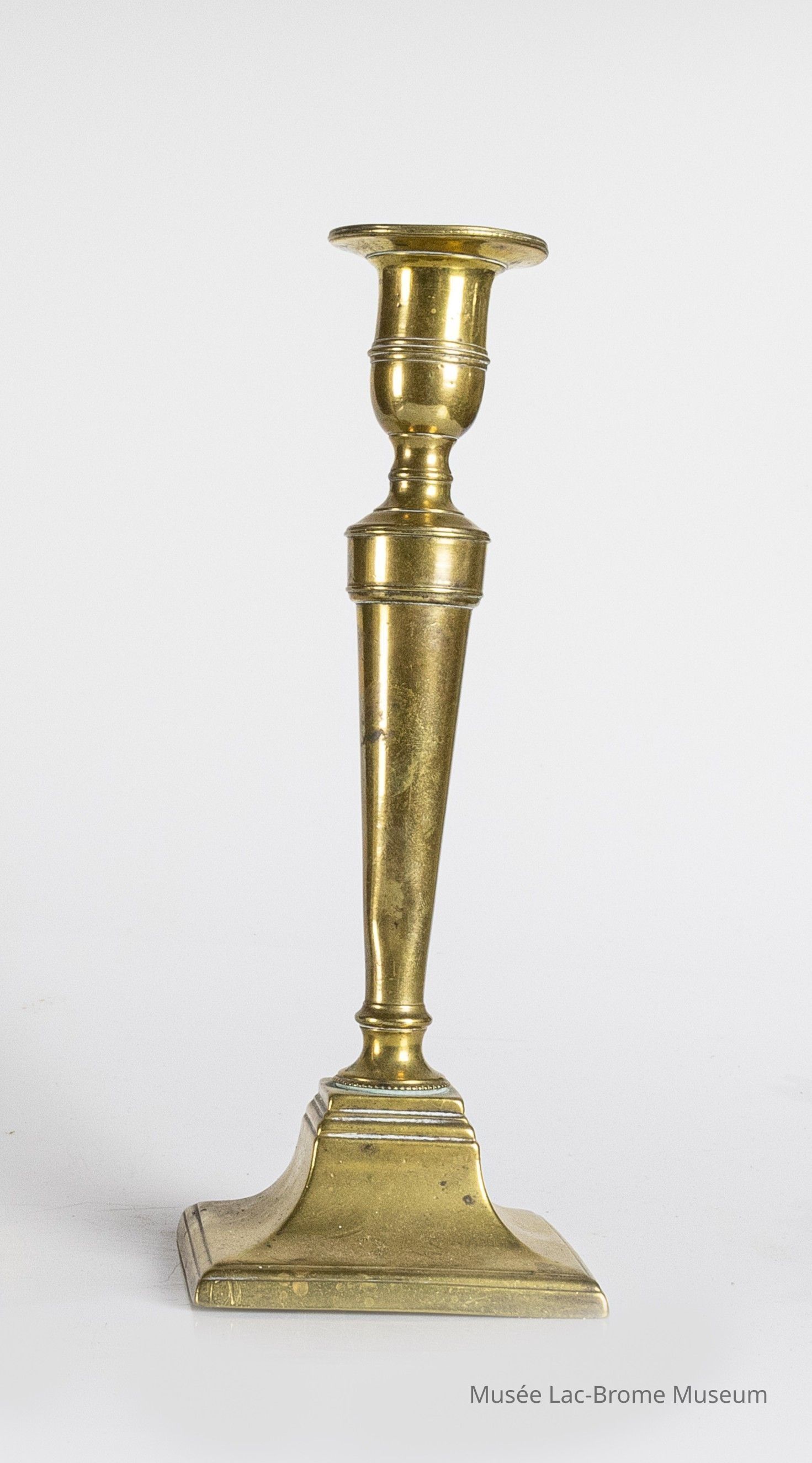 Ce bougeoir en métal présente une base carrée, des épaules arrondies et une vasque en forme de coupe.Context