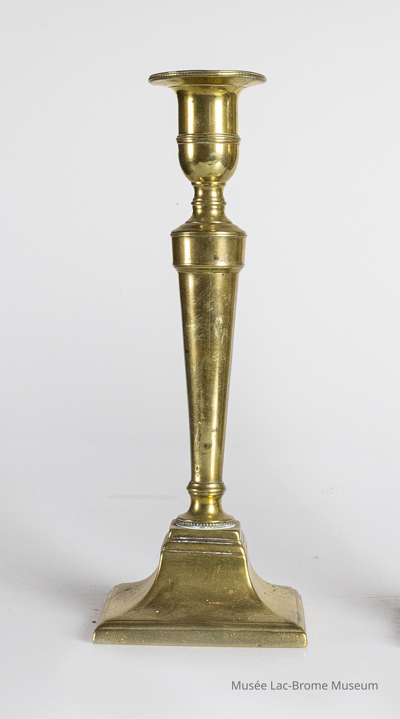 This candlestick belonged to General Roswell Olcott, the son of Peter Olcott, Lieutenant Governor of Vermont. Roswell Olcott was appointed General in the Vermont Militia. According to an article written by Jack Little, Roswell and his wife, Lydia Sherman, moved onto his brother's lands in Brome County in 1805 after he failed to build a turnpike he had been hired to construct in Vermont.