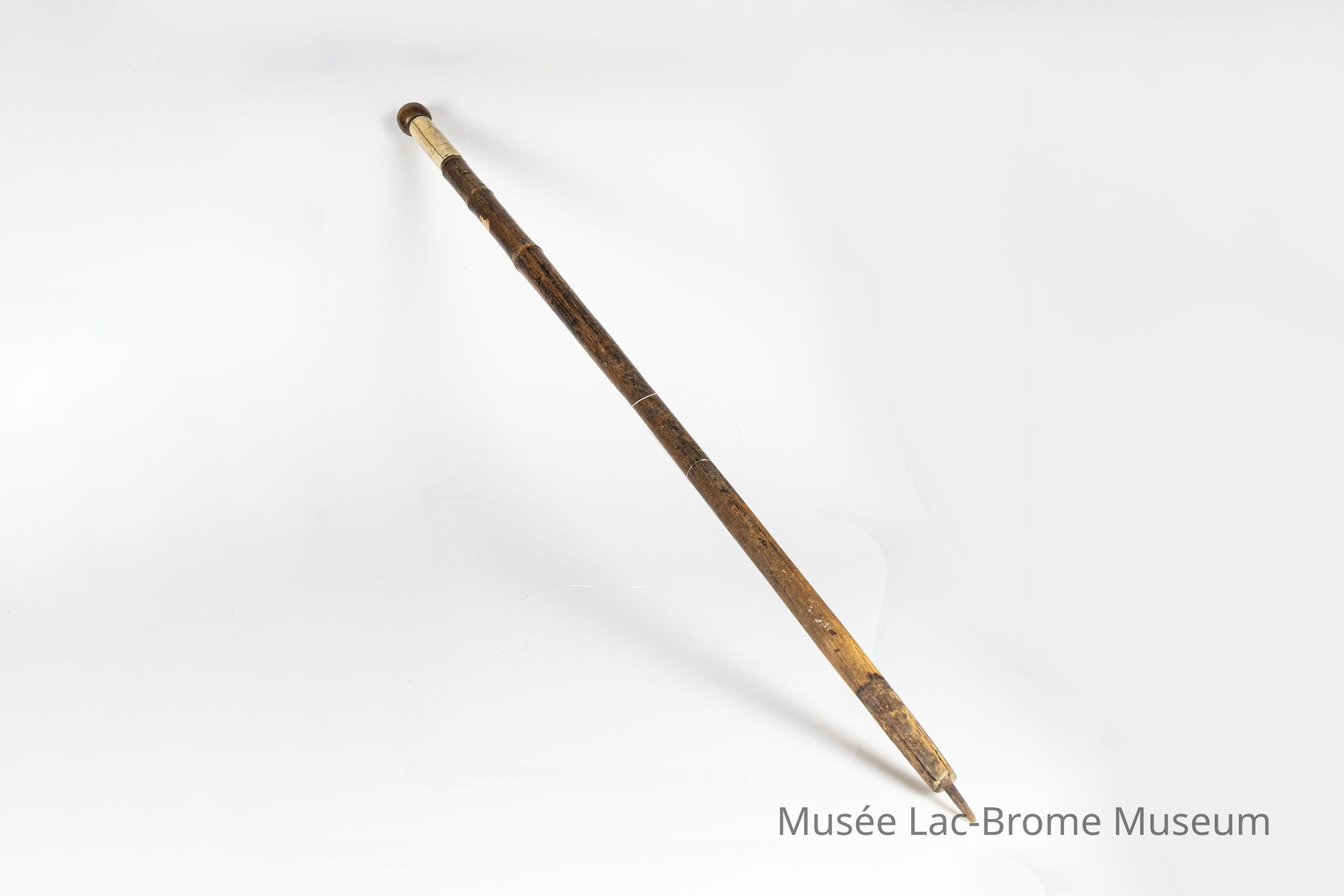 Un long morceau de bois cylindrique et droit, muni d'un manche blanc en os d'animal et d'une pointe métallique à l'autre extrémité. Il semble recouvert d'une couche de peinture noire usée.Context