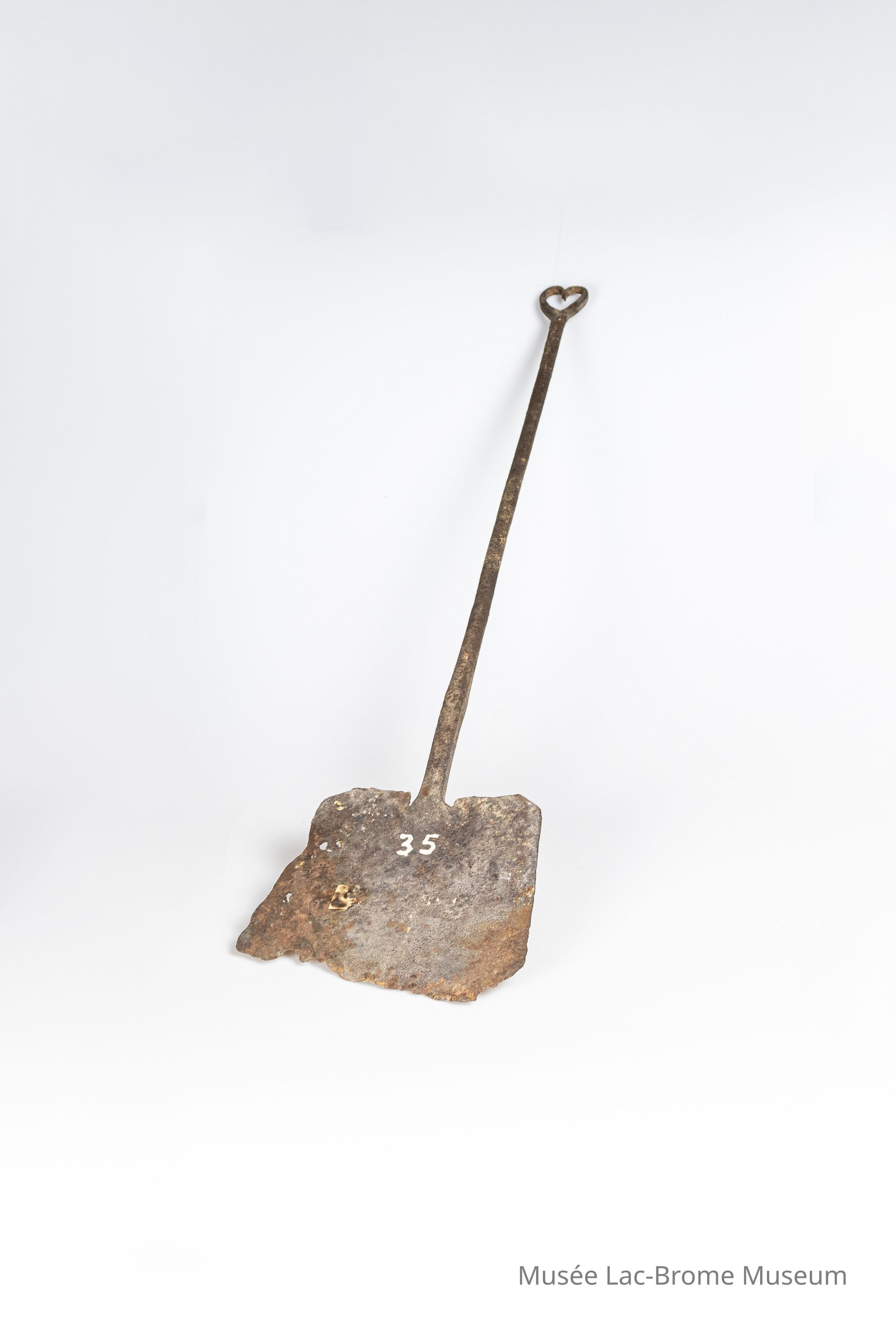 Une petite pelle en fer, faite à la main, avec un détail en forme de cœur à l'extrémité du manche. La pelle est rouillée et son bord est déformé.Context