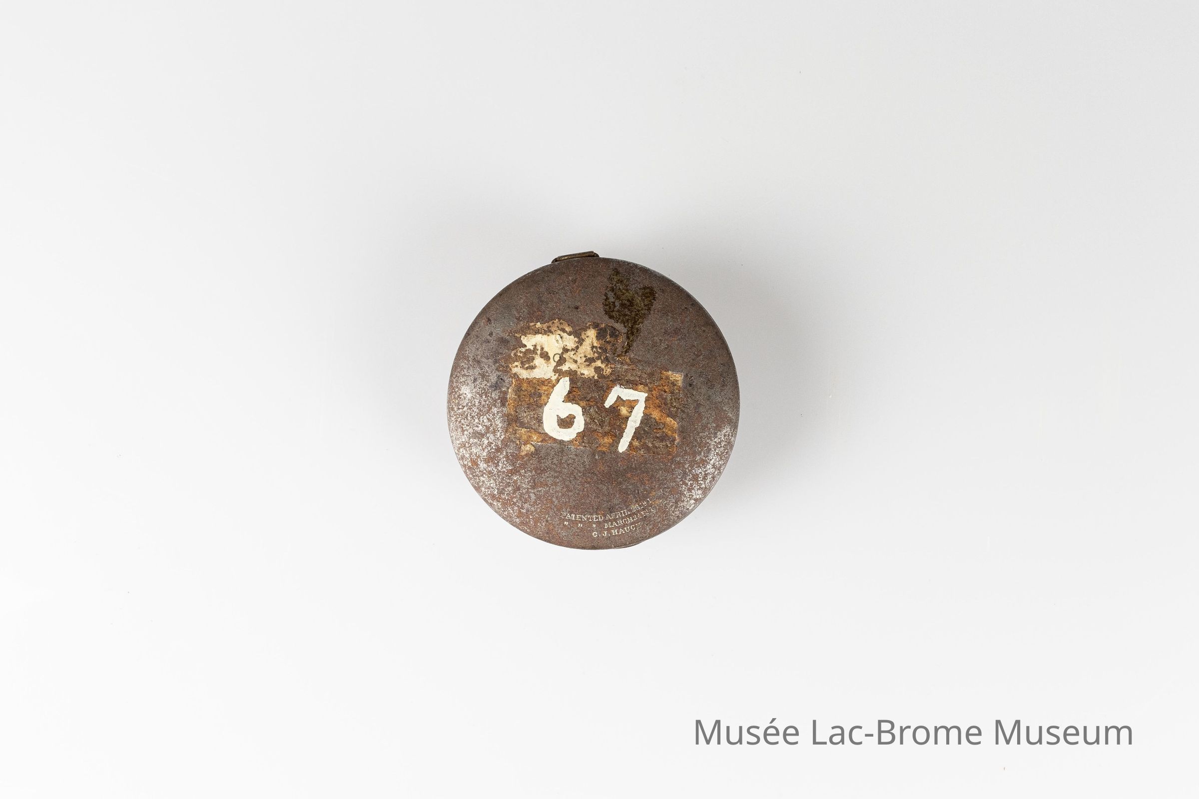 Récipient rond en métal terni, muni d'une charnière pour le fermer.Context