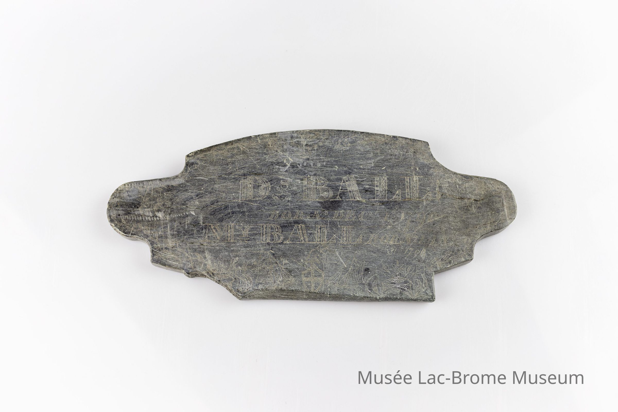 Une petite plaque d'ardoise grisâtre sur laquelle sont gravés les noms de D. S. Ball et M. J. Ball, ainsi que leurs dates de naissance. La plaque a une forme effilée, les bords supérieur et inférieur étant étroits et le centre s'évasant pour être plus épais. Les bords de la face avant sont ornés de motifs floraux décoratifs et d'un bateau gravé.Context