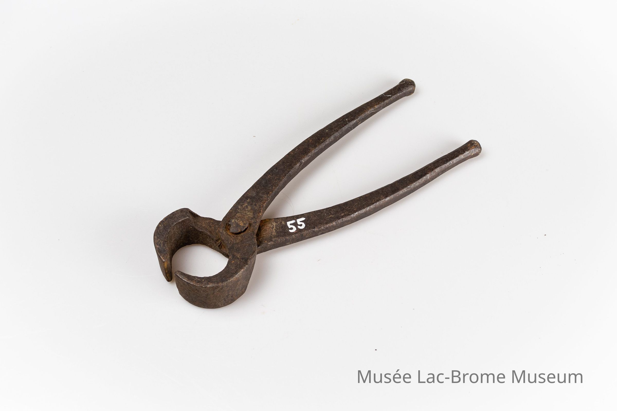 Selon le donateur, cette paire de pinces a été fabriquée par Joseph Eldridge en 1812 ou 1813 à partir de fer de Brome. L'atelier d'Eldridge se trouvait à l'emplacement où fut plus tard construit le magasin de feu H.R. Williams à Brome. Le donateur affirme que le charbon utilisé pour la fonte provenait du lot Westover à North Sutton, mais que cette source de charbon n'a pas duré longtemps.