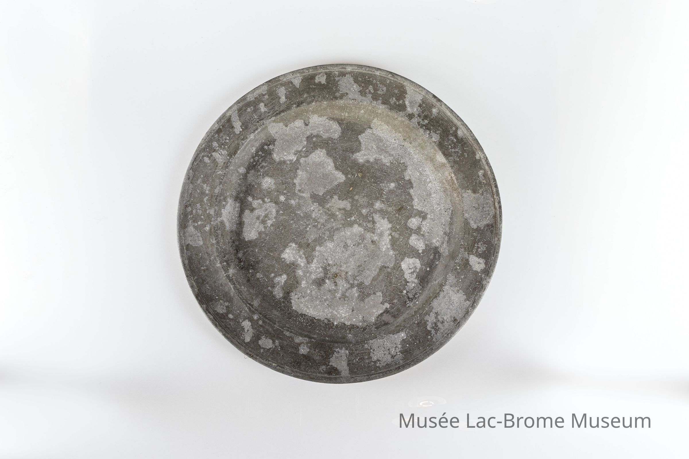 A round pewter plate with a slight curve in the middle. / Une assiette ronde en étain avec une légère courbe au milieu.Context