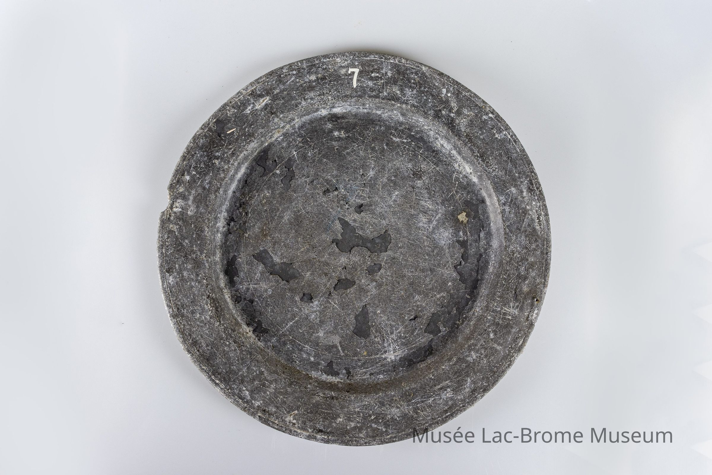 Un grand plateau circulaire gris en étain. La surface du plateau est usée, avec des éraflures et des marques d'usure. Il semble également qu'une matière grise s'écaille au centre du plateau.Context