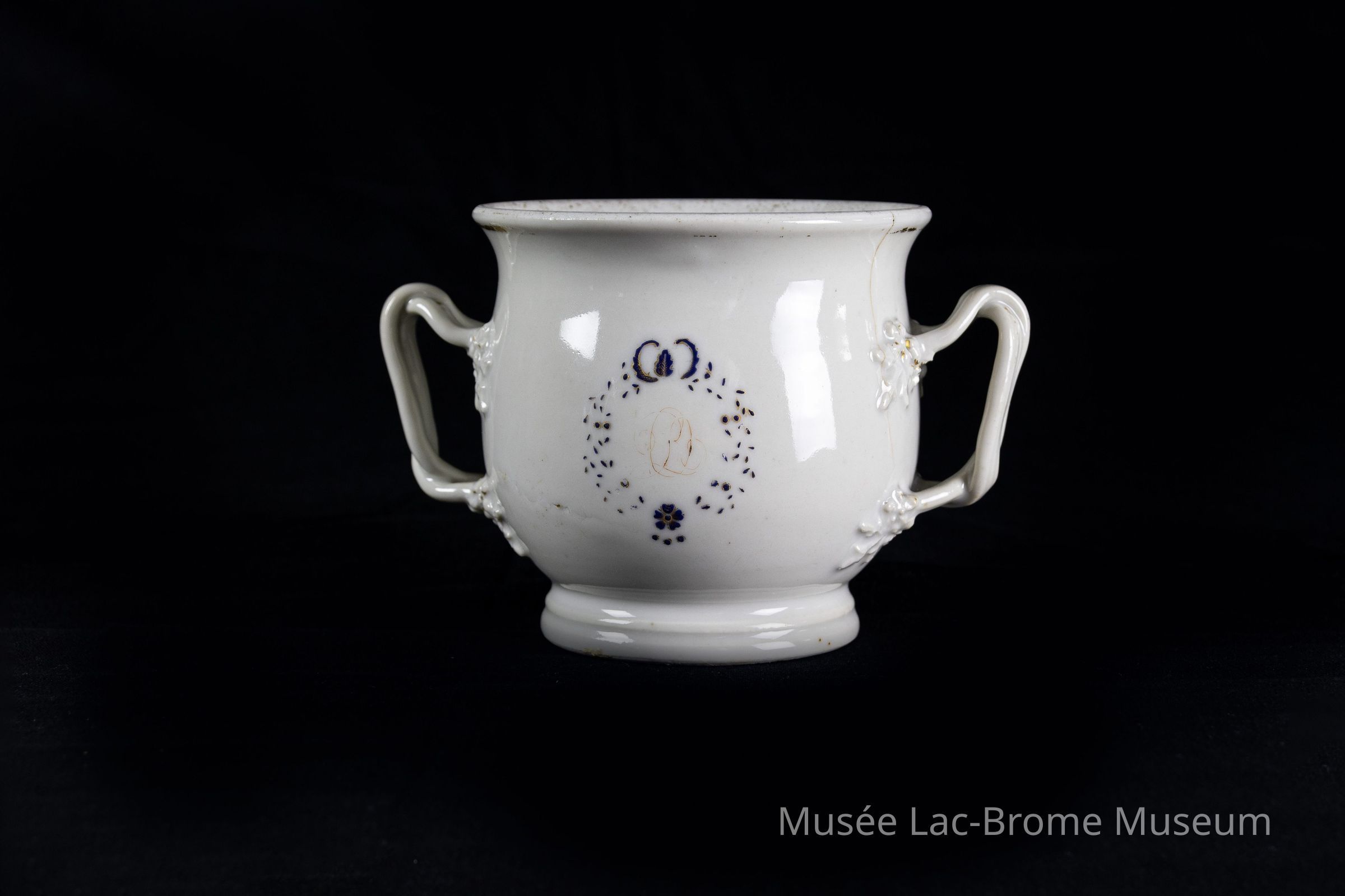Un sucrier en porcelaine blanche ou en porcelaine avec des poignées assorties, présentant un motif naturel. Le monogramme « LRO » est entouré de feuilles, d'une fleur à cinq pétales sous les lettres et d'une couronne au-dessus des lettres.Context
