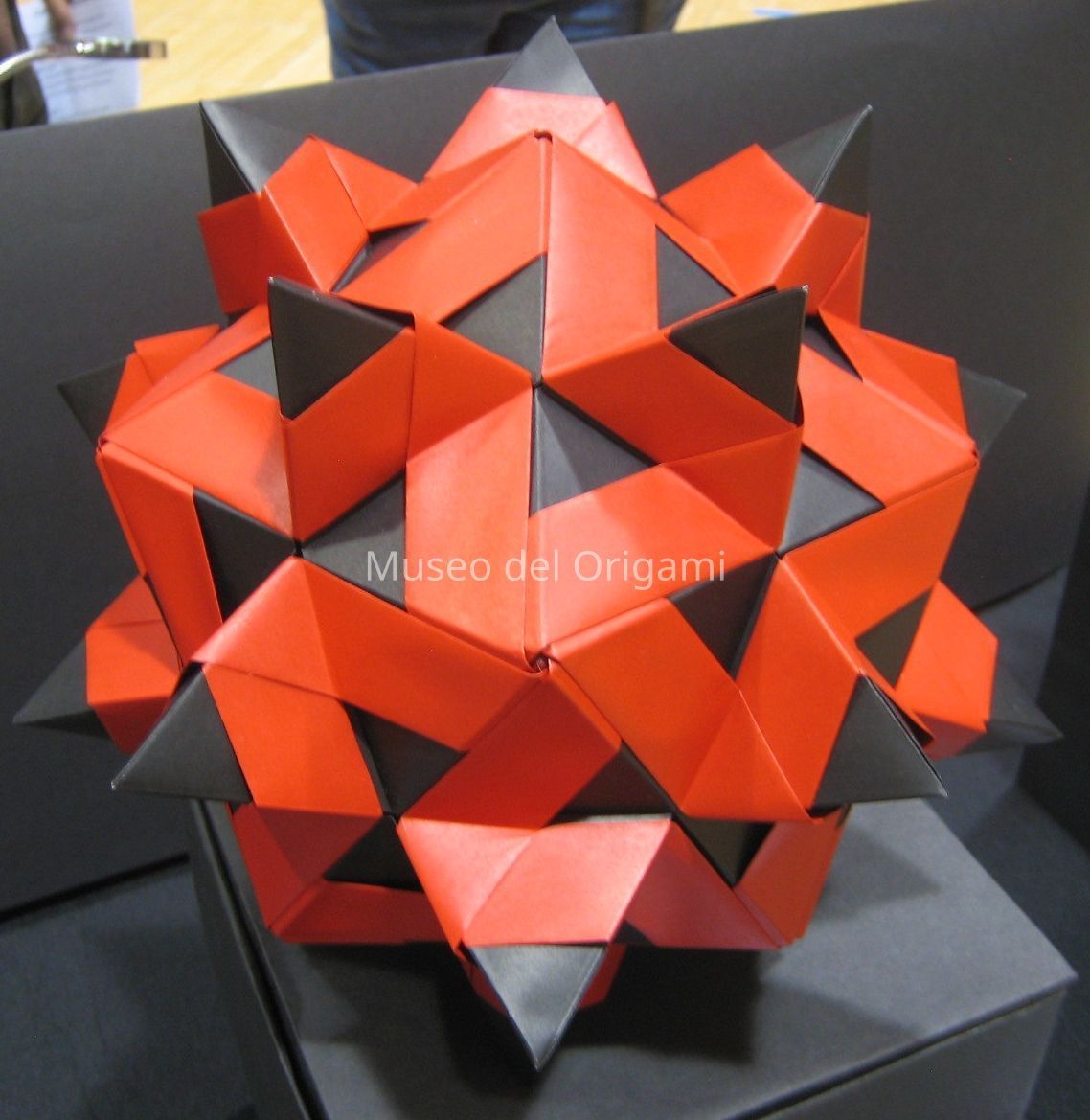 Sixty 15 cm squares of duo red/black origami paper, interlocked with no glue.Context