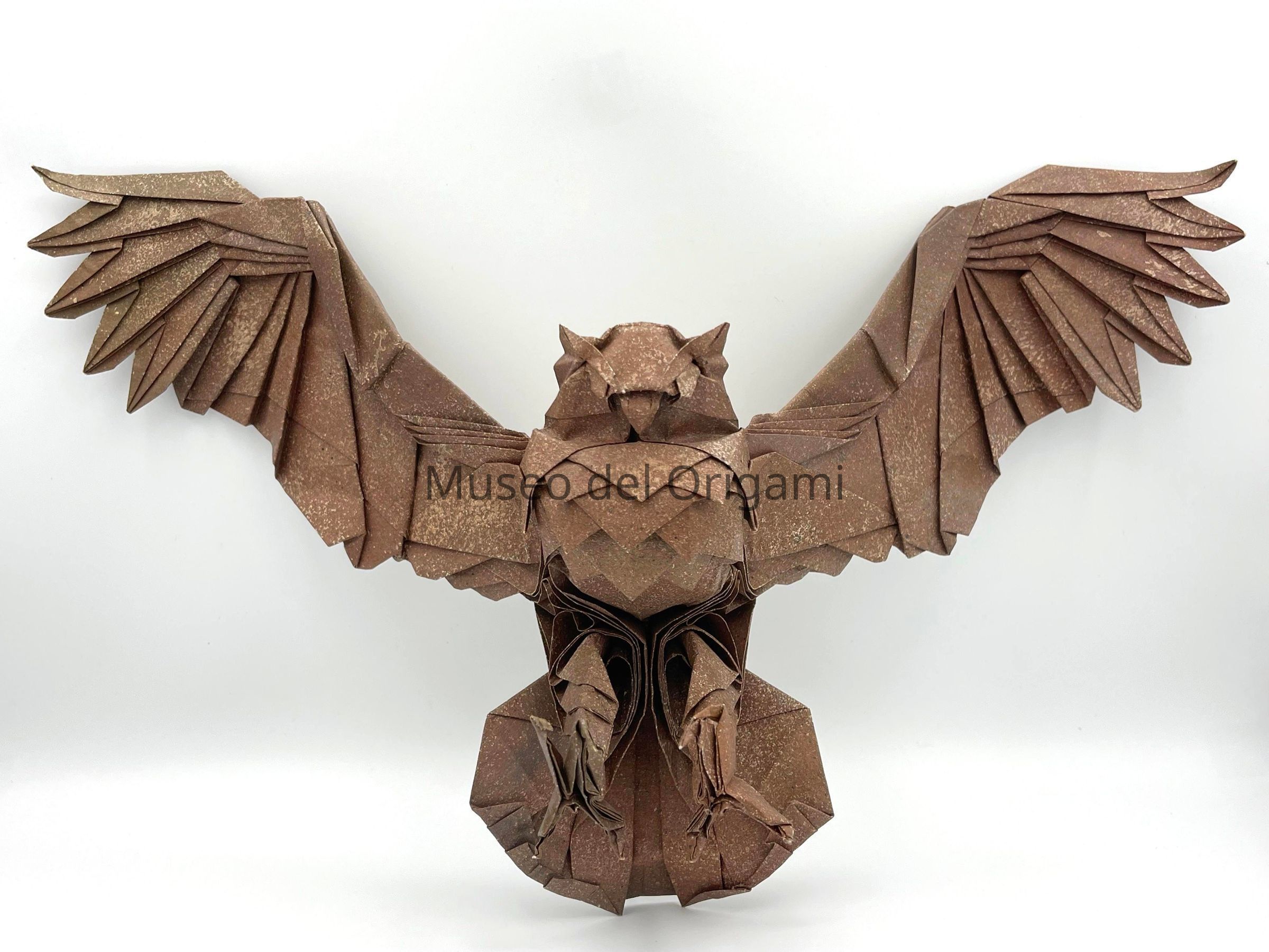Fish Owl (Búho pescador), Designed by Kyohei Katsuta. Folded by Kuo Fang Nan. Made with a single square, 62 cm x 62 cm, painted and stained by the artist.