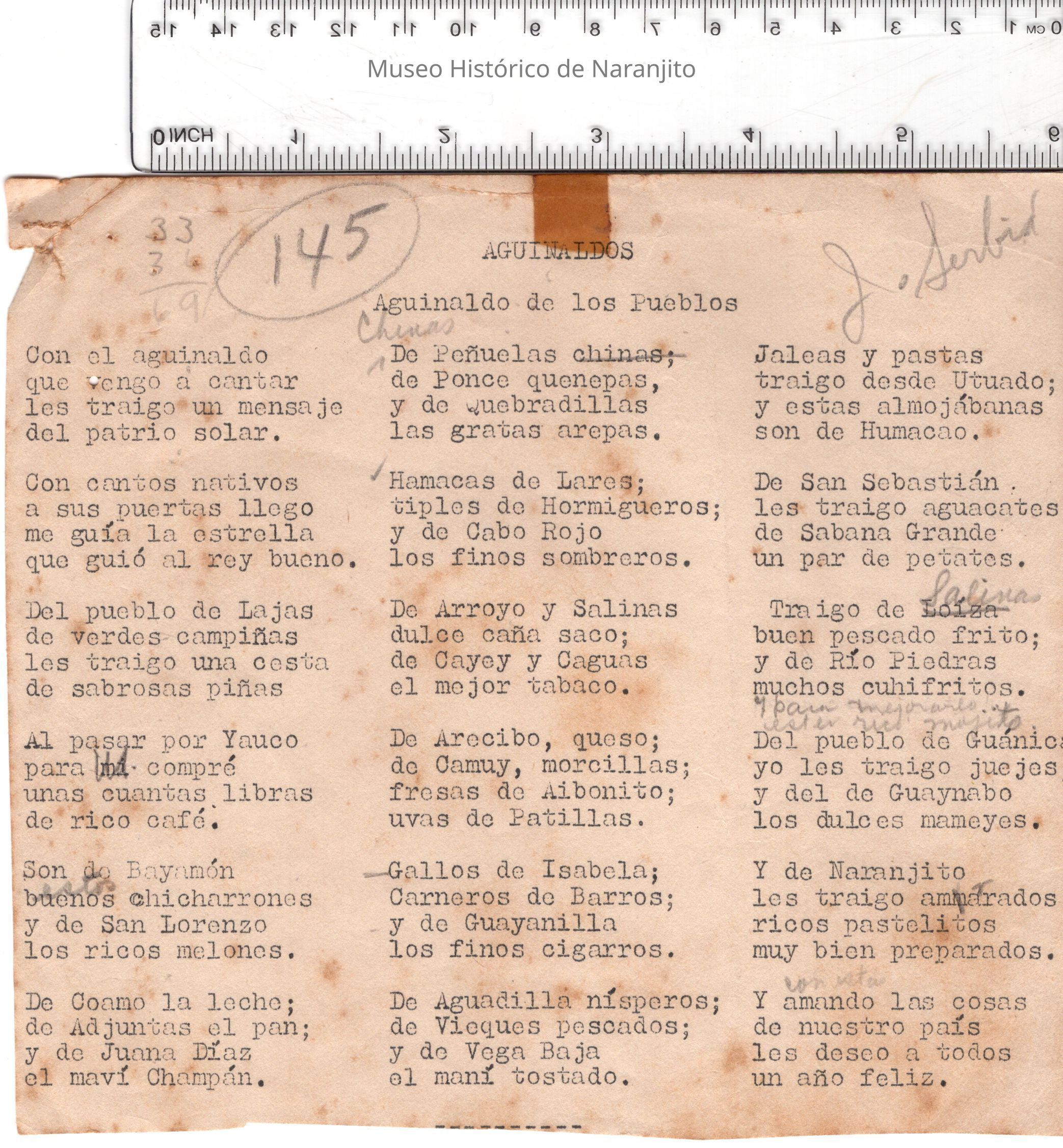 Lírica transcrita de aguinaldo folclórico de Puerto Rico el cual menciona el nombre de cada pueblo de la isla.Collection