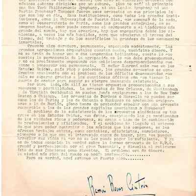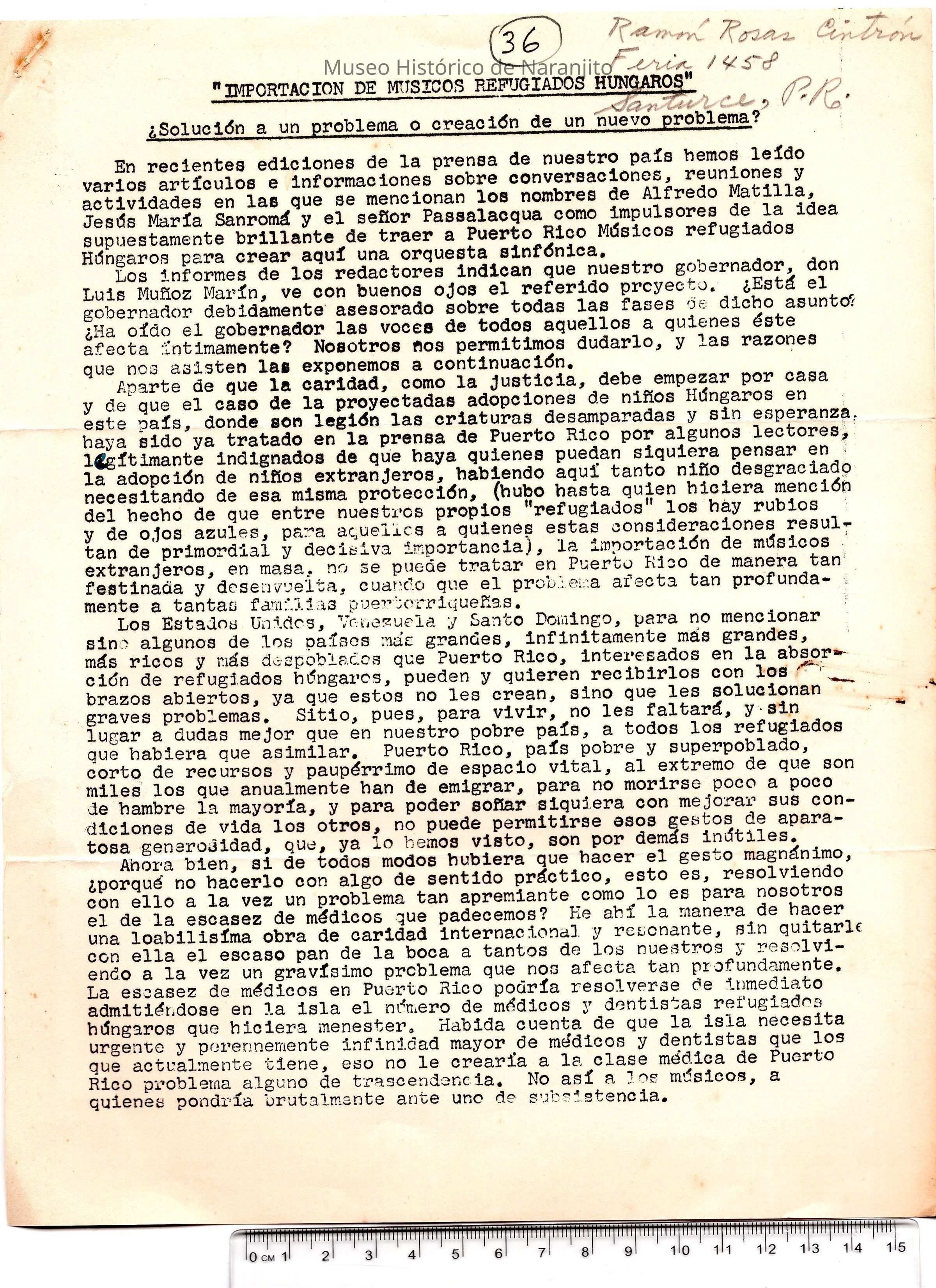 Ensayo argumentativo bajo el título "Importación de músicos refugiados húngaros" ¿Solución a un problema o creación de un nuevo problema?", que debate la idea de importar músicos refugiados húngaros al país para la creación de una nueva orquesta sinfónica. El documento presenta correcciones ortográficas a mano.Collection