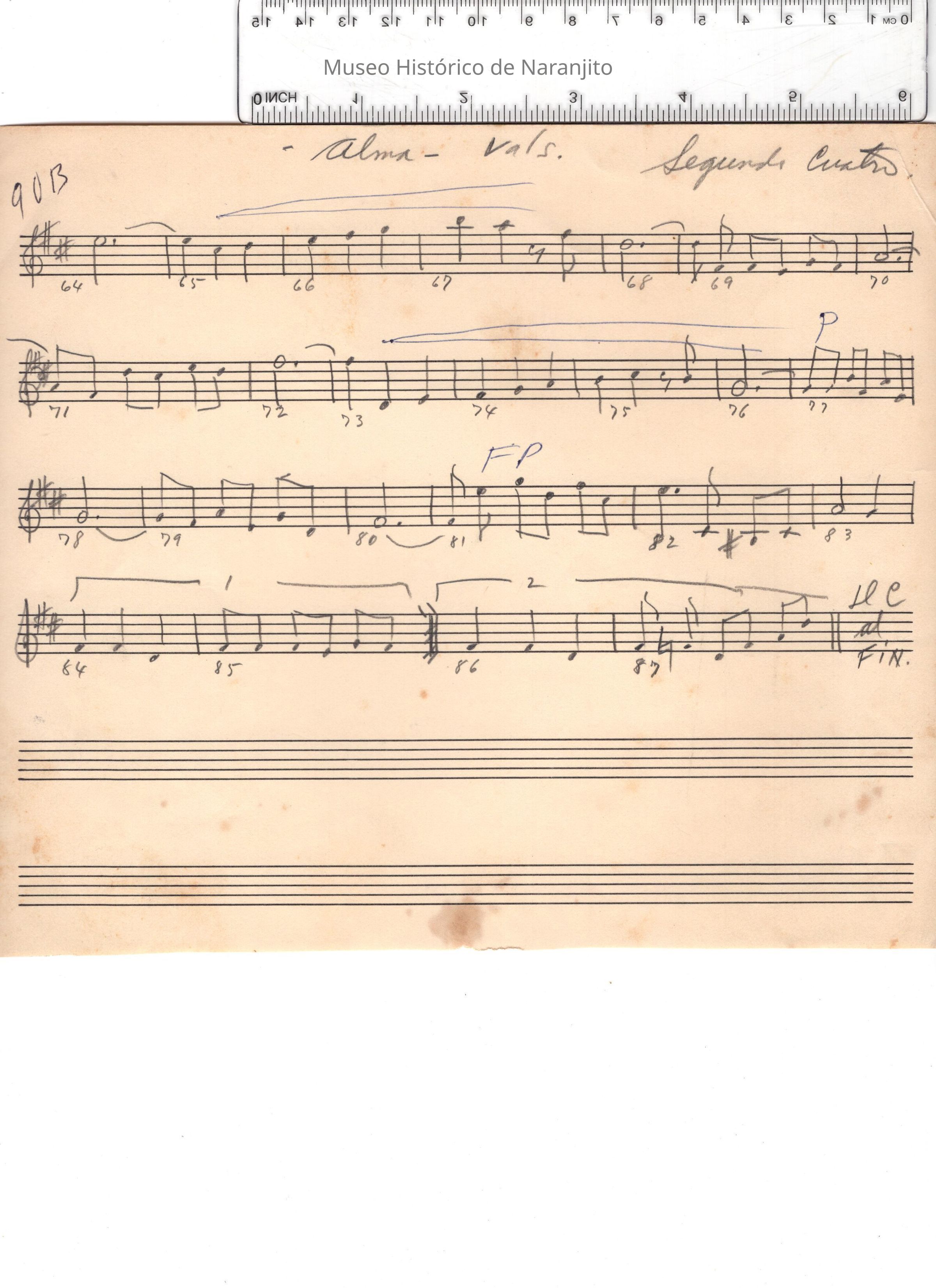 Partitura transcrita para el cuatro puertorriqueño de la canción de vals "Alma".