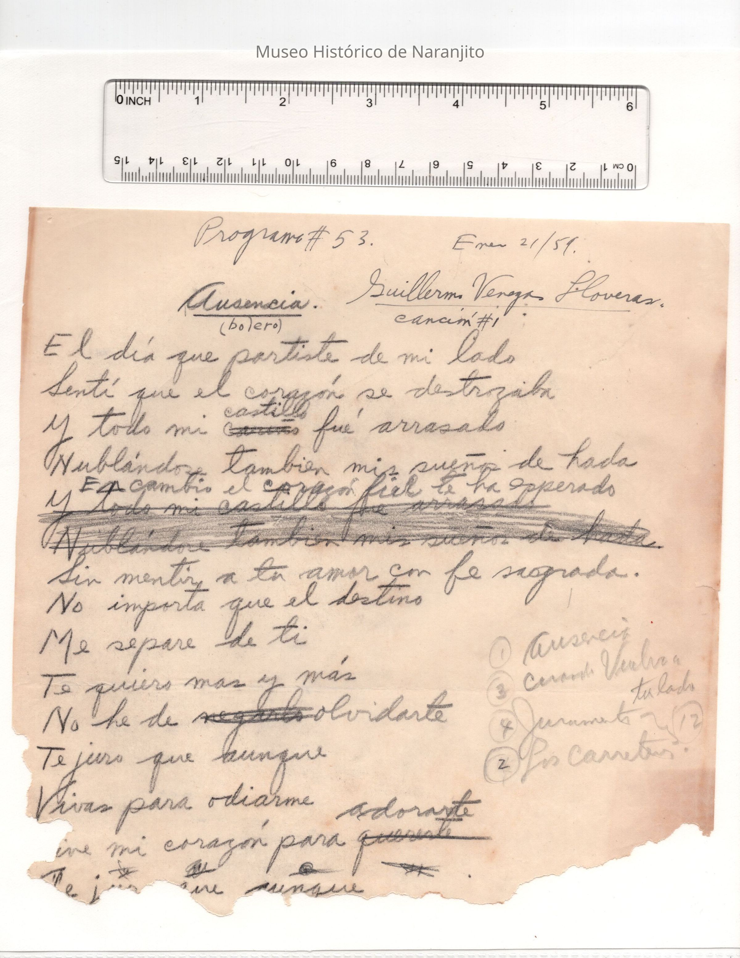 Lírica transcrita de la canción titulada "Ausencia" por el autor puertorriqueño Guillermo Venega Lloveras.