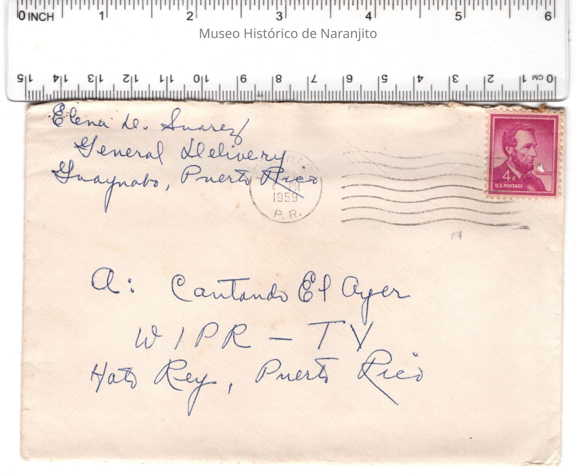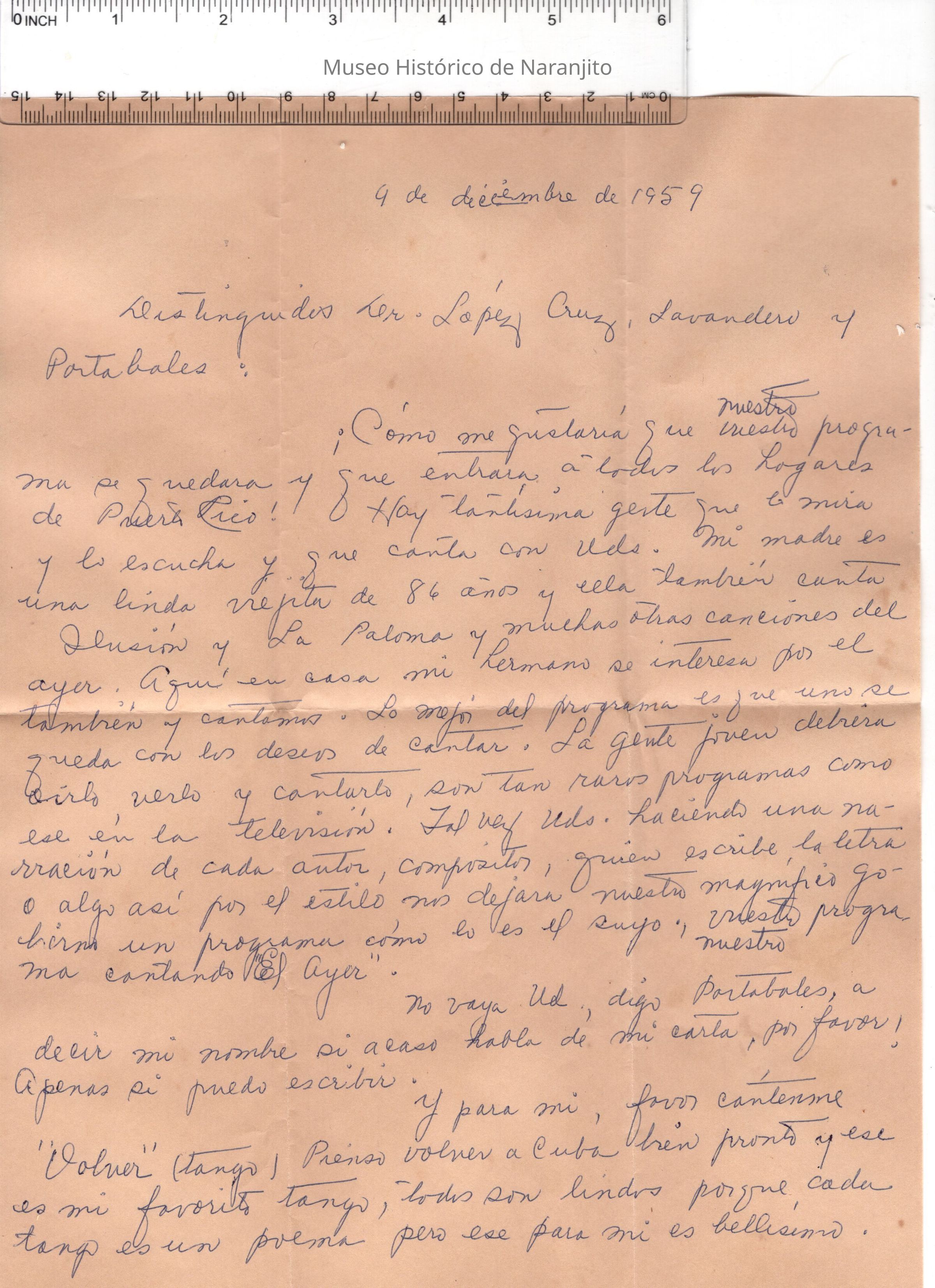 Carta escrita por una oyente cubana residiendo en el pueblo de Guaynabo, dirigida a el programa de radio puertorriqueño "Cantando el ayer". En esta solicita le canten la cancion de tango " Volver".