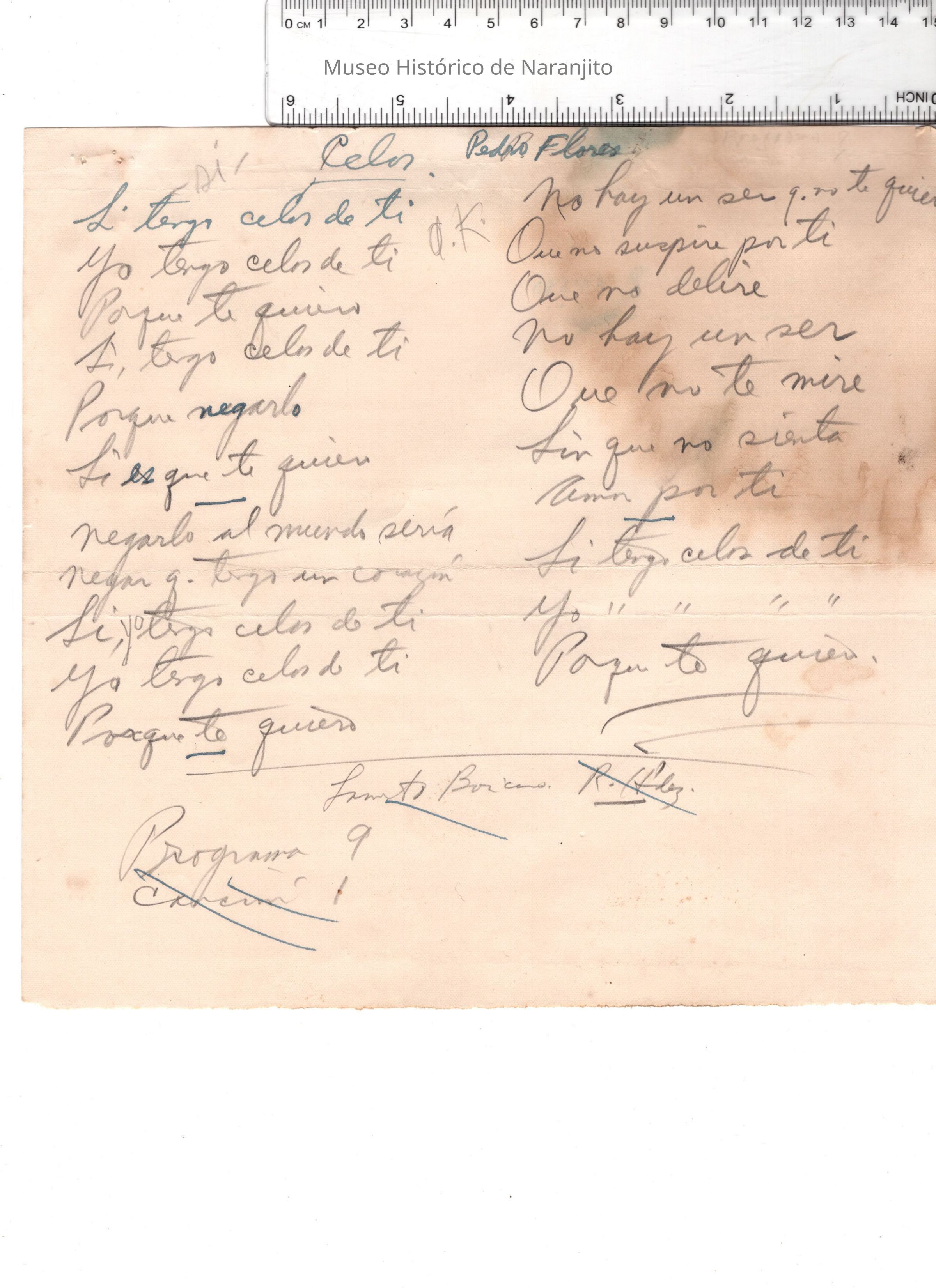 Lírica transcrita de la canción "Celos" por el compositor de boleros puertorriqueño Pedro Flores.Collection