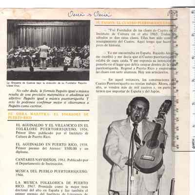 Página de una publicación impresa que podría ser de la publicación "Quién es quien". En ella se encuentra una entrevista realizada a Francisco "Paquito" López Cruz sobre su enseñanza en la universidad y su aportación en la música. En el mismo se encuentran varias fotografías de él en sus distintas etapas de vida.Collection