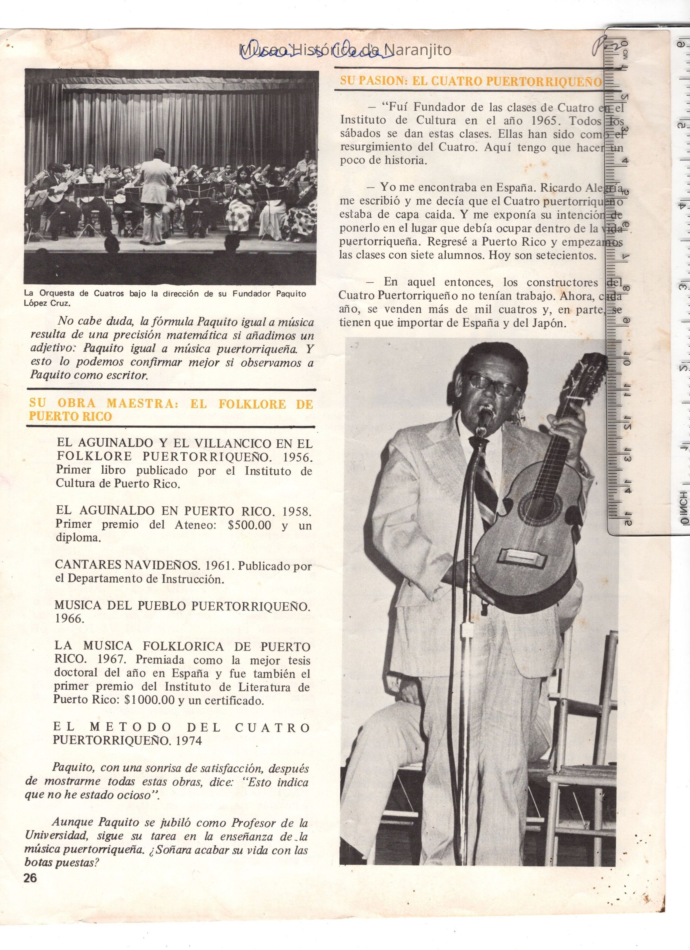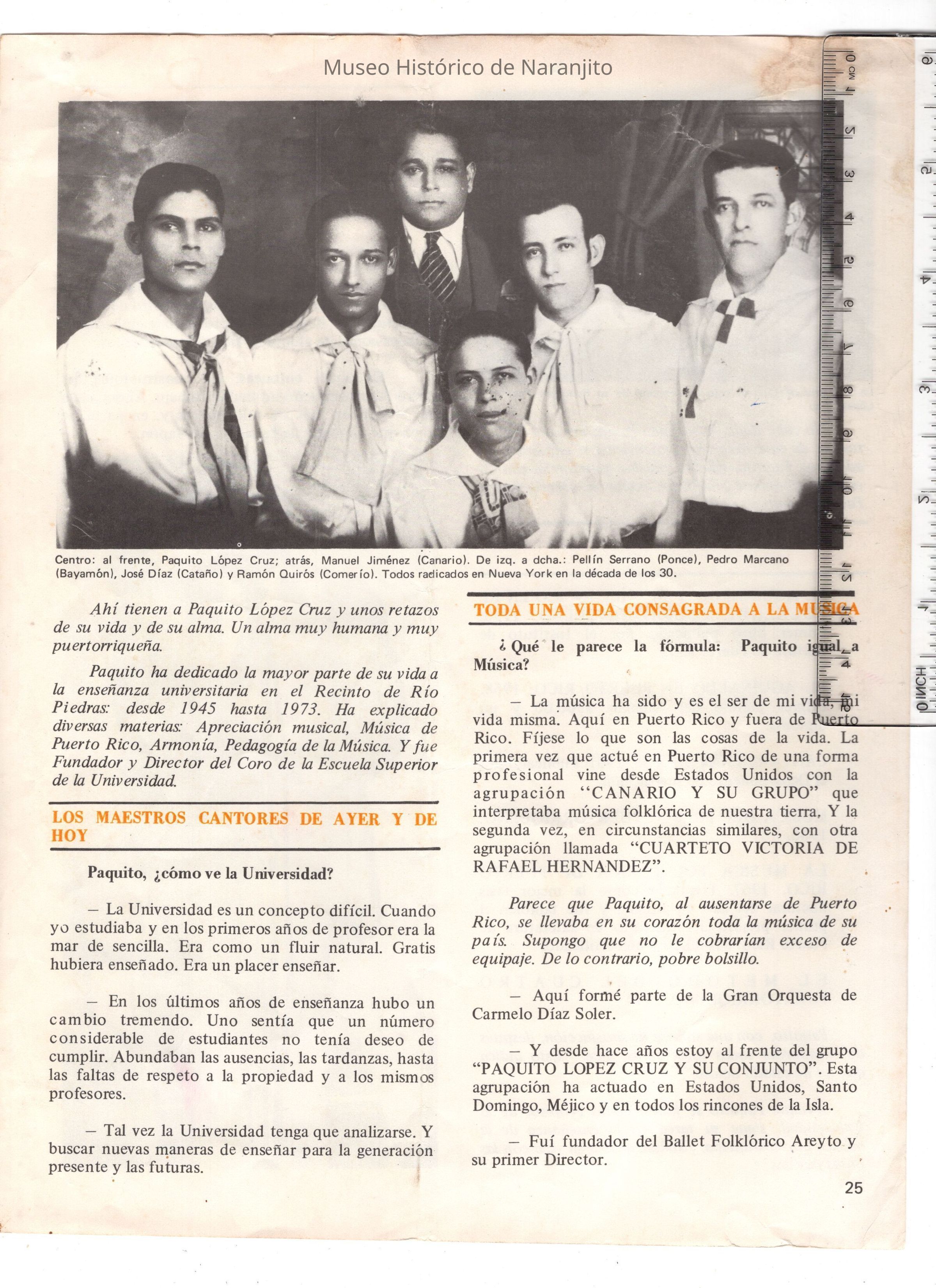 Página de una publicación impresa que podría ser de la publicación "Quién es quien". En ella se encuentra una entrevista realizada a Francisco "Paquito" López Cruz sobre su enseñanza en la universidad y su aportación en la música. En el mismo se encuentran varias fotografías de él en sus distintas etapas de vida.Creator