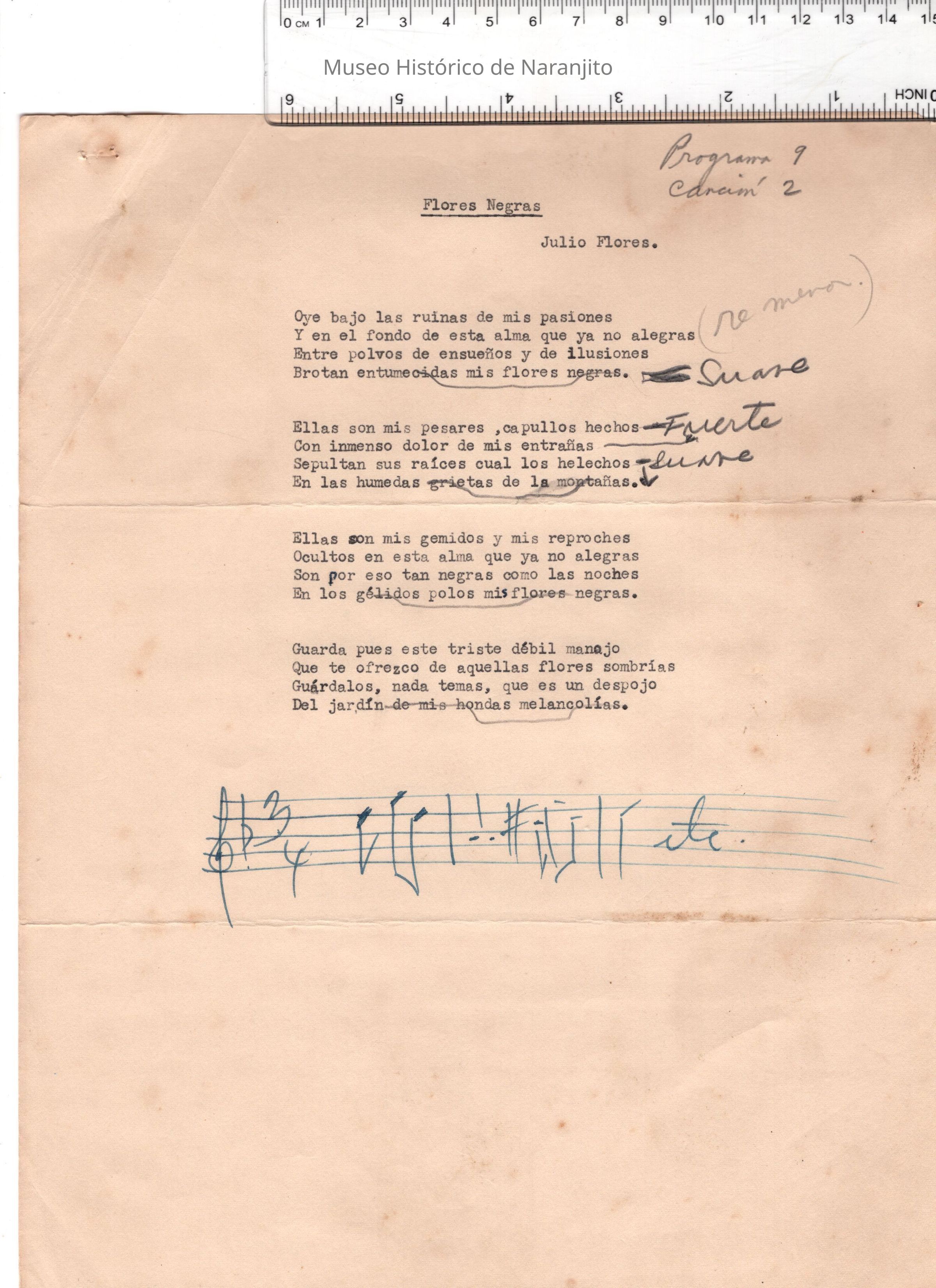 Lírica y partitura transcrita de la canción "Flores negras" del autor colombiano Julio Flórez.